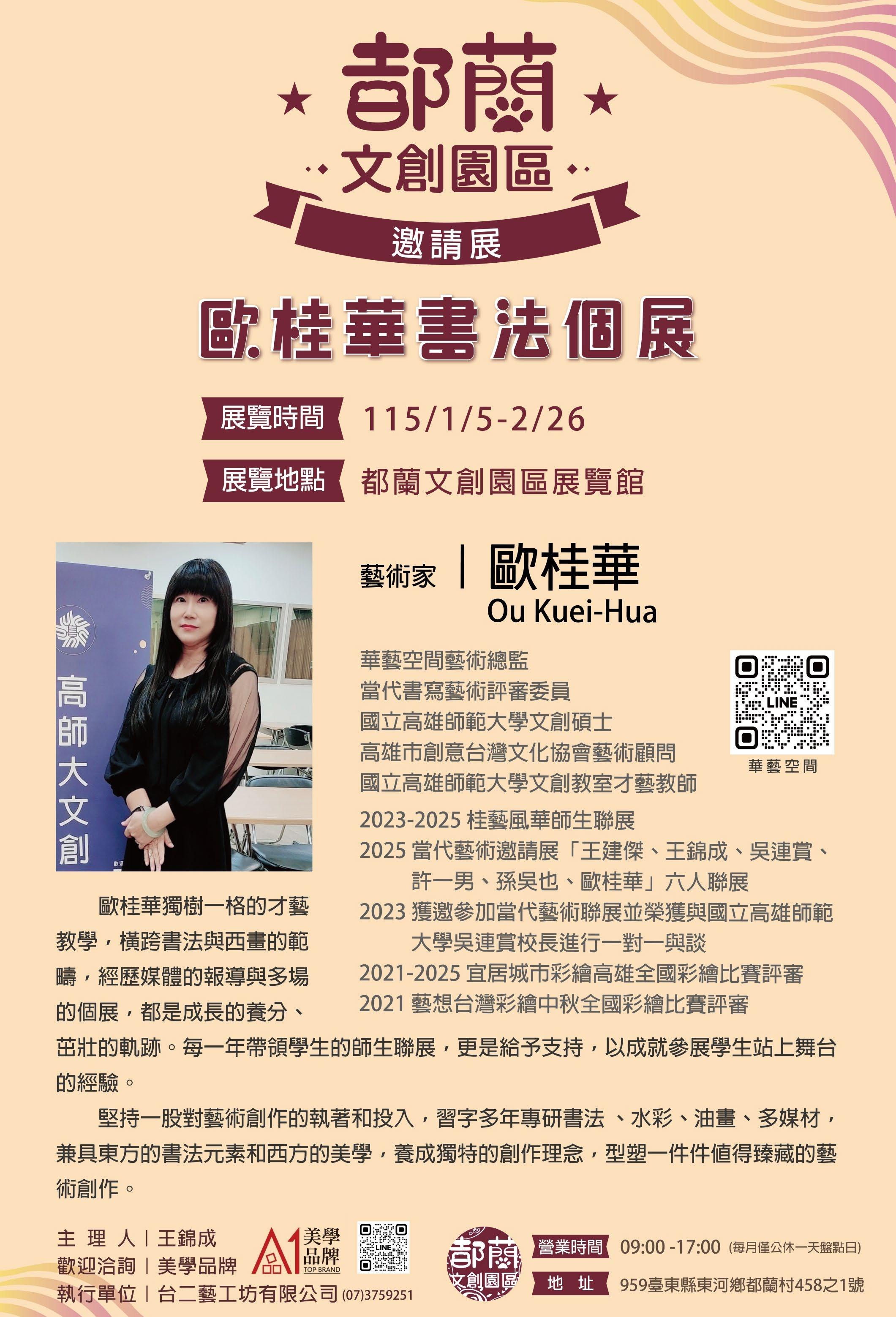 歐桂華堅持一股對藝術創作的執著和投 入,習字多年專研書法、水彩、油畫、多 媒材,兼具東方的書法元素和西方的美 學,養成獨特的創作理念,型塑一件件值 得臻藏的藝術創作。此次展覽以書法作品 為主,呈現其書法文字造形之美與筆墨意 境,彰顯書法作為文化載體所承擔的深厚 內涵,讓觀眾在欣賞過程中體會書藝於時 代脈絡中的延續與創新,並進一步思索其 在當代藝術場域中的價值與意義。