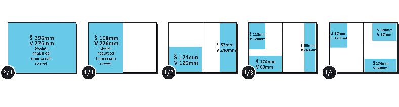 PREDAJA GOTOVIH MATERIJALA Materijali se šalju u TIFF (300 dpi) ili PDF formatu omjera 1:1 prema priloženim dimenzijama. Oglasi koji idu u rez moraju imati minimalno 3 mm napusta na sve četiri strane. Materijali moraju biti u CMYK kolor modelu, a fontovi pretvoreni u krivulje. Materijali se šalju na e-mail adresu: grafika@okz.hr