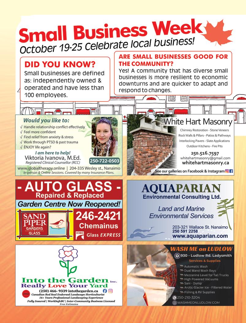 Mondays. … Then on Tuesday morning, we do Penelakut at the youth centre over on the island. We go over, set up tables, [and] set up the food, [and] people come in and select what they need. Then Thetis is Thursday, and we do Chemainus on Tuesday evening and Friday morning.” Premade hampers can also be ordered online and either picked up or delivered as needed. Monetary donations and government funding are used to purchase the much-needed staples, but it’s a team effort to feed the community. They receive regular food donations from local businesses and citizens, support from other food banks like the Ladysmith Resources Centre Association and Loaves and Fishes, and financial donations.