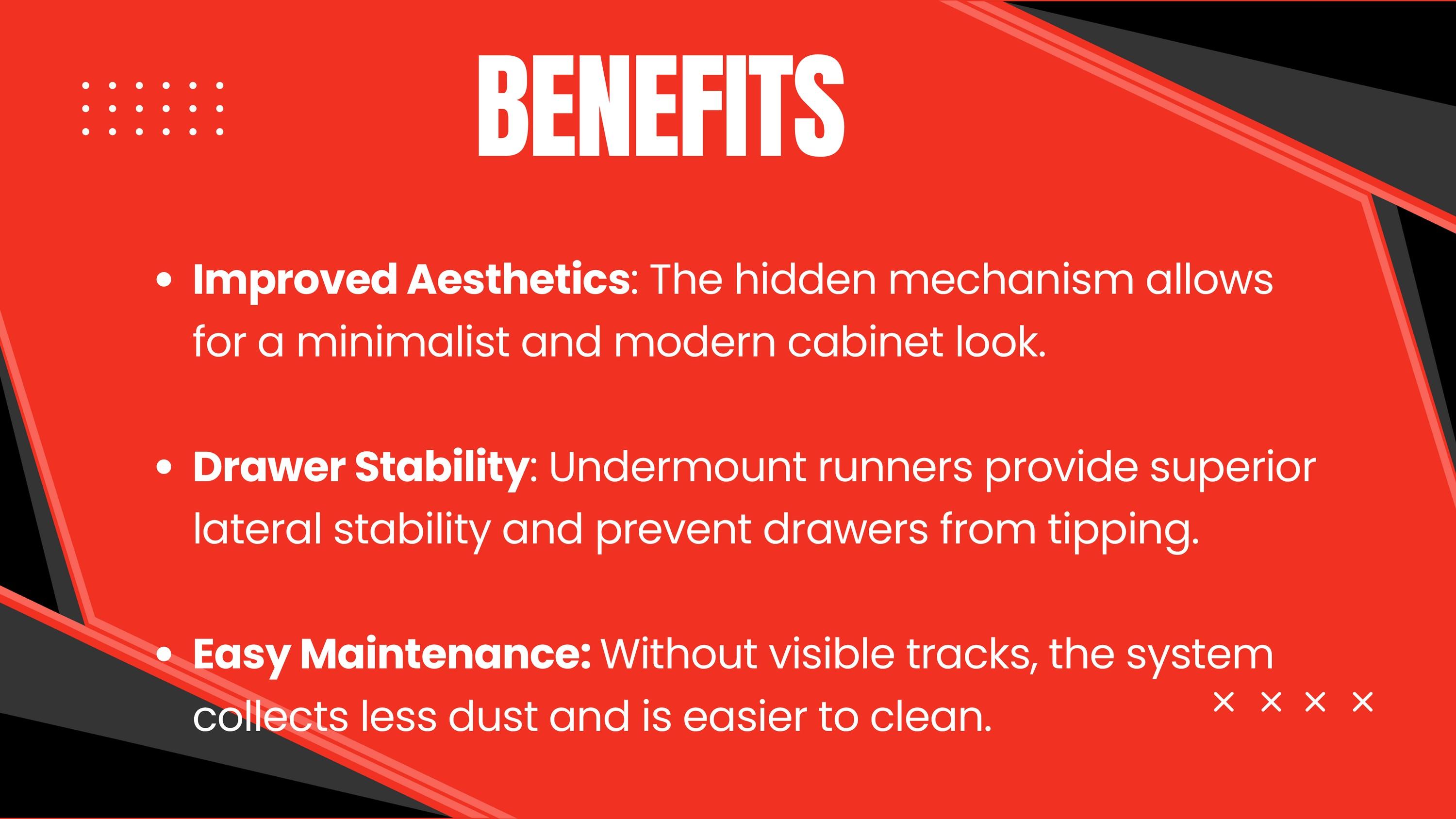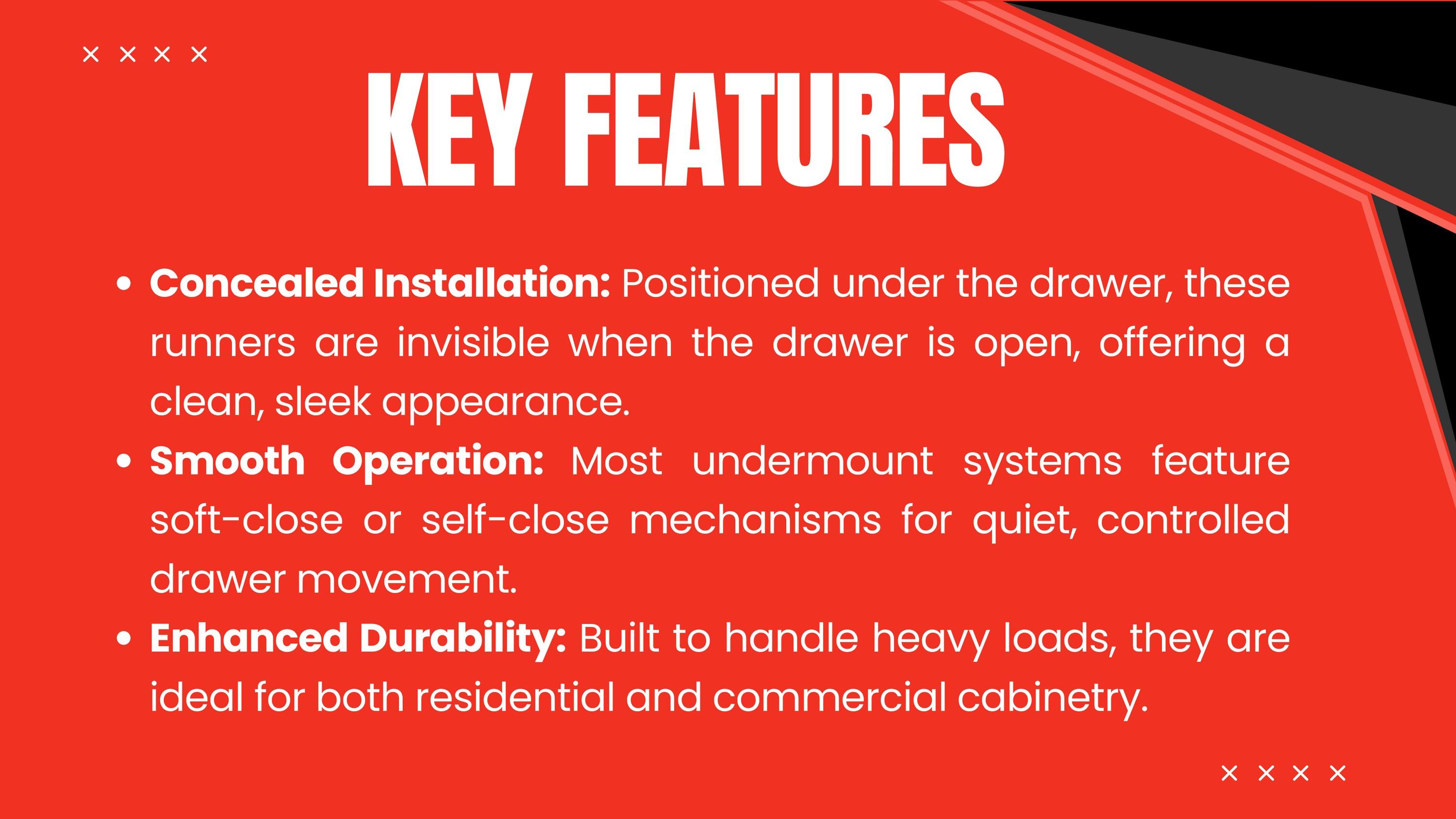 Undermount drawer runners are a popular choice in modern cabinetry, offering a clean, seamless look while providing robust support and smooth operation. Unlike traditional side-mounted runners, these are concealed beneath the drawer, enhancing both functionality and aesthetics.