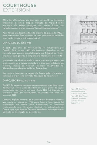 O PROJETO DE 1924-1925 A partir dos anos de 1916 Asplund foi influenciado por Camillo Sitte, e em 1925 ele forneceu desenhos só da extensão que ecoava completamente ao Tribunal de Tessin original, o que ganhou a simpatia da imprensa e do comitê. No interior ele eliminou toda a troca humana que existia no projeto anterior e deixou mais duro e lítico com influência do Hellerau Theatre de Heinrich Tessenow, em Dresden na Alemanha e também os edifícios Beaux-Arts. Em meio a tudo isso, a praça não havia sido reformada e com isso o projeto da extensão foi pausado novamente.