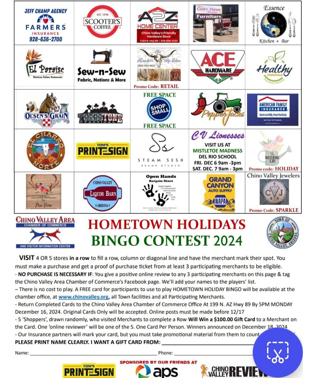 Hometown Holidays are going on now! Holiday Bingo and the Highway 89 Lighting Contest are back! Visit Chino Valley Chamber, a participating merchant for details, or email Annie at chamber@chinovalley.org.