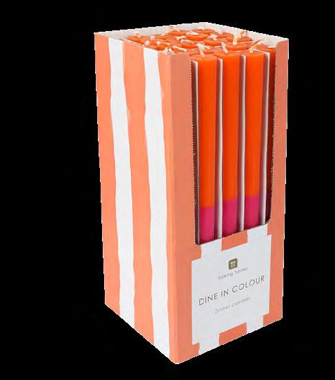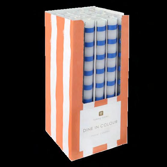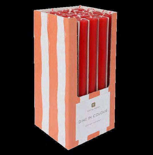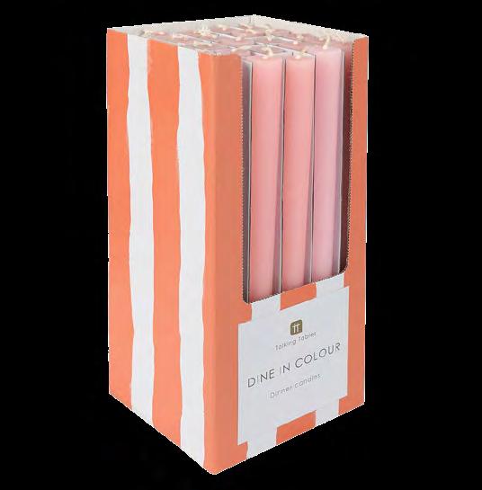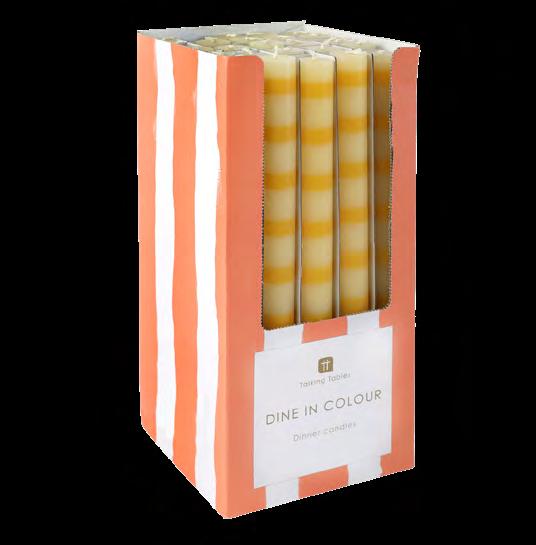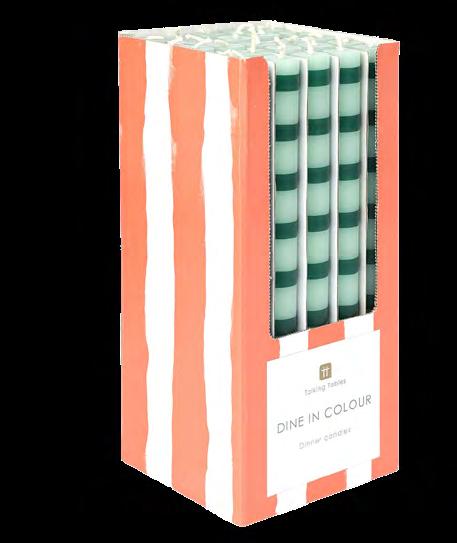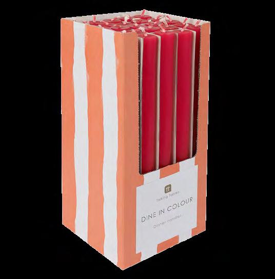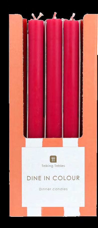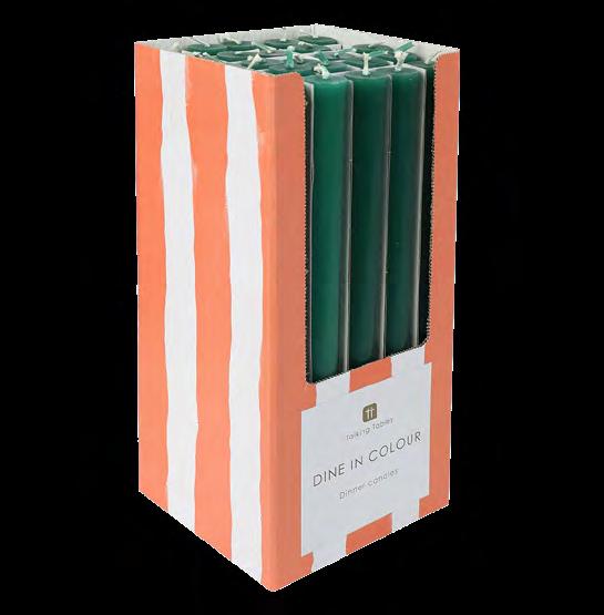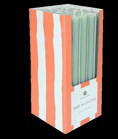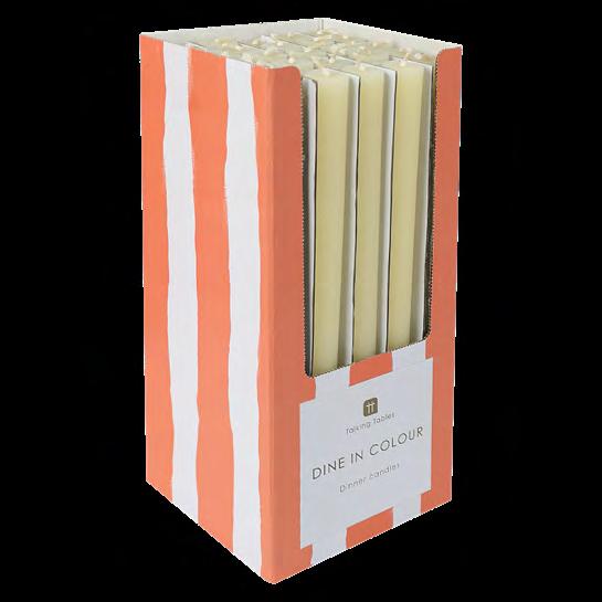 Our premium quality Dine in Colour dinner candles are hand poured in Vietnam and sold in a handy printed CDU made from recycled material.