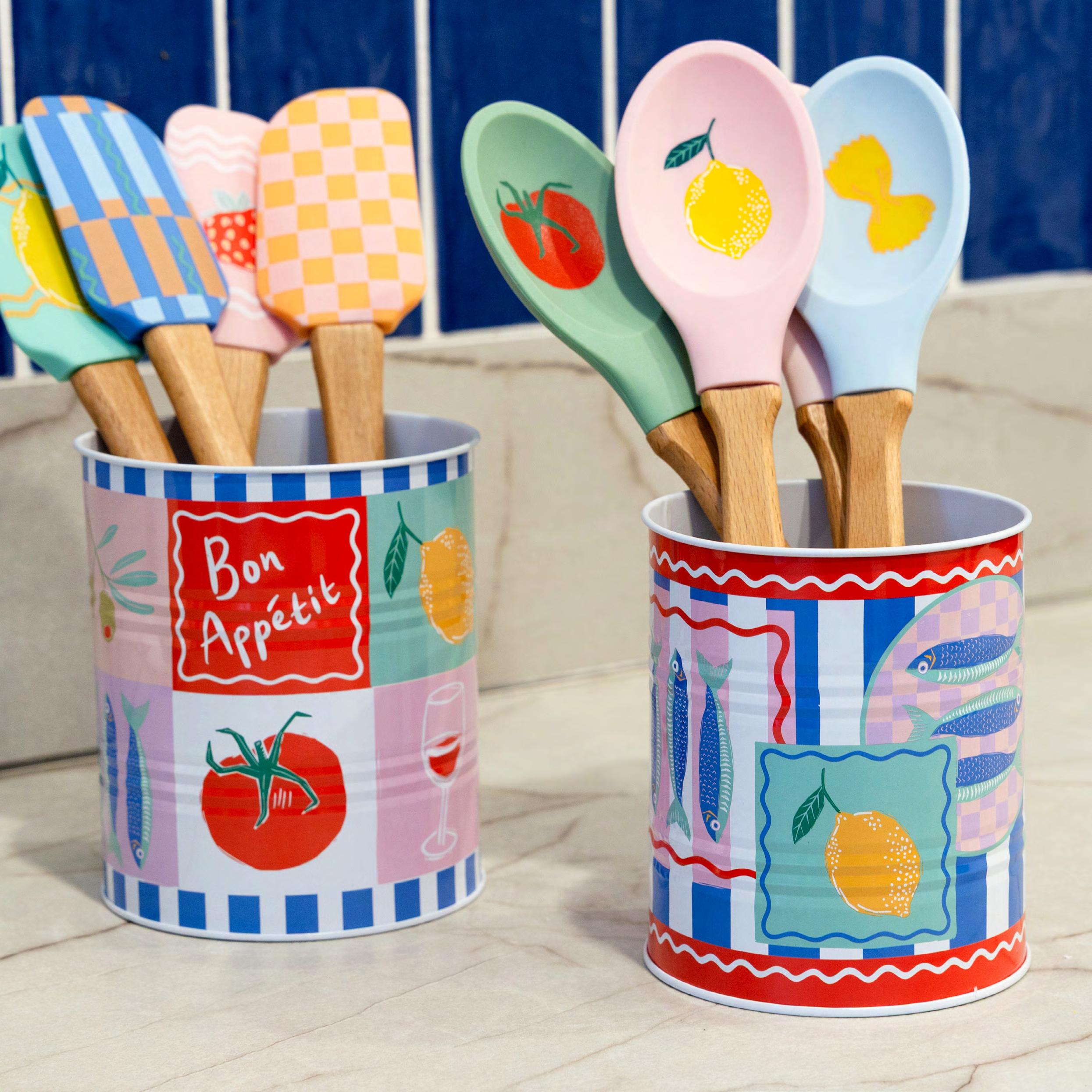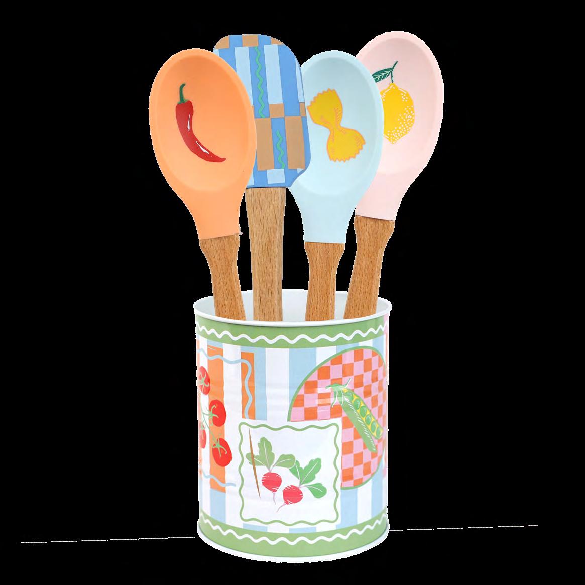Our new kitchen utensils feature a food safe silicone head paired with a wooden handle. The set includes both spoons and spatulas which pair perfectly with our new storage tins.