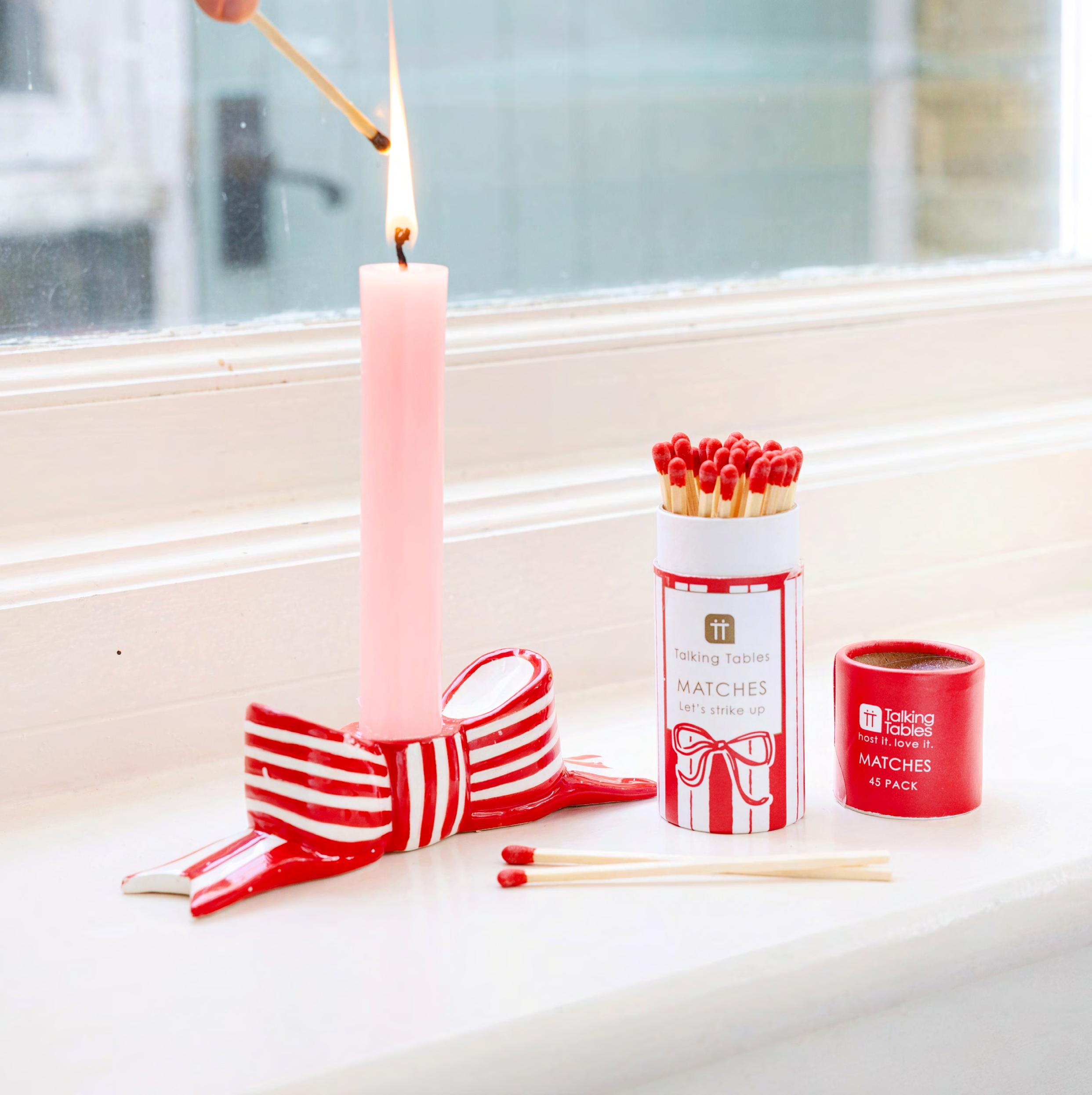 The new Candy Christmas collection, as well as cross selling with existing Talking Tables products, was predominantly inspired by the bow trend, adding in a hand drawn stripe. Included are a sweet bow napkin, saucer crackers, matches, candles and a ceramic bow candle holder.