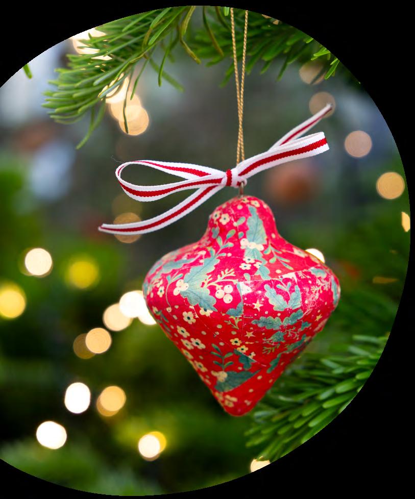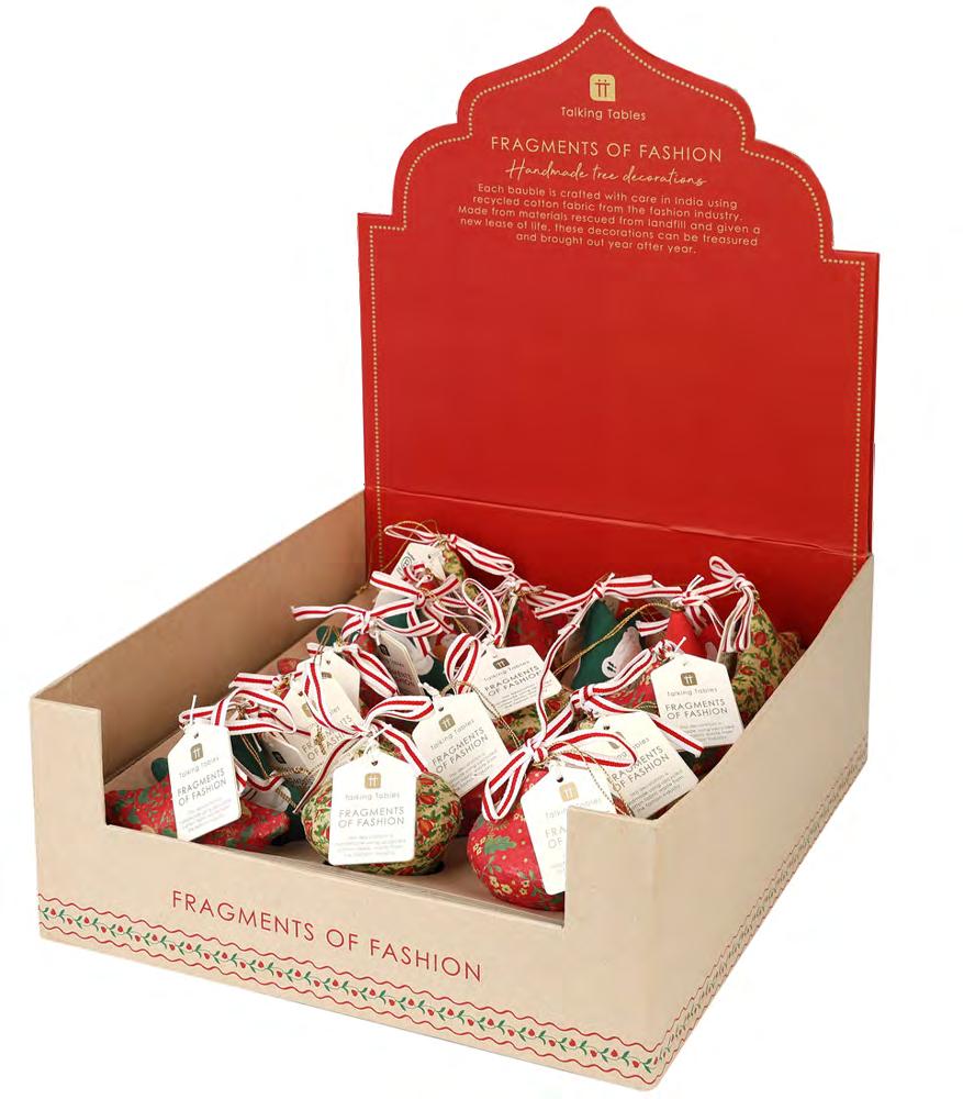 Our tree decorations are hand made from upcycled shredded cotton fabric waste from the fashion industry. They are made in India in a set up powered by solar energy and recycled water and with local women workers.