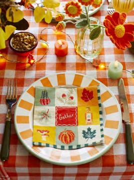 Our new Autumn collection has a complementary colour palette to both our Hot Stuff and Halloween ranges and so can be mixed and matched with them. It includes a new colourway for our popular cotton gingham collection of tablecloths and napkins/tea towels.