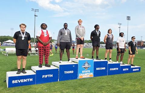 Jake Atwood (Lawton Chiles High School) stands atop of the podium during the medal ceremony for the 5A discuss event.