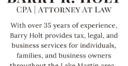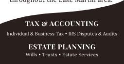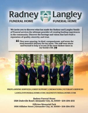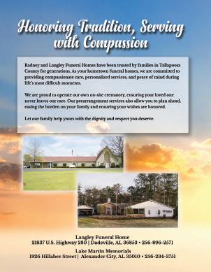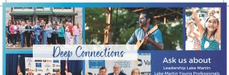 New leadership has stepped forward in both Alexander City and Dadeville, bringing fresh ideas to the small towns. Meet Alexander City Mayor Mike Densmore on page 122 and Dadeville Mayor Chuck Ledbetter on page 114 as they share their vision for the future of their communities. On page 20, read about The Dadeville-Lake Martin Area Chamber’s first CEO, Bridgett Thornell, marking another step forward in connecting members throughout the town.