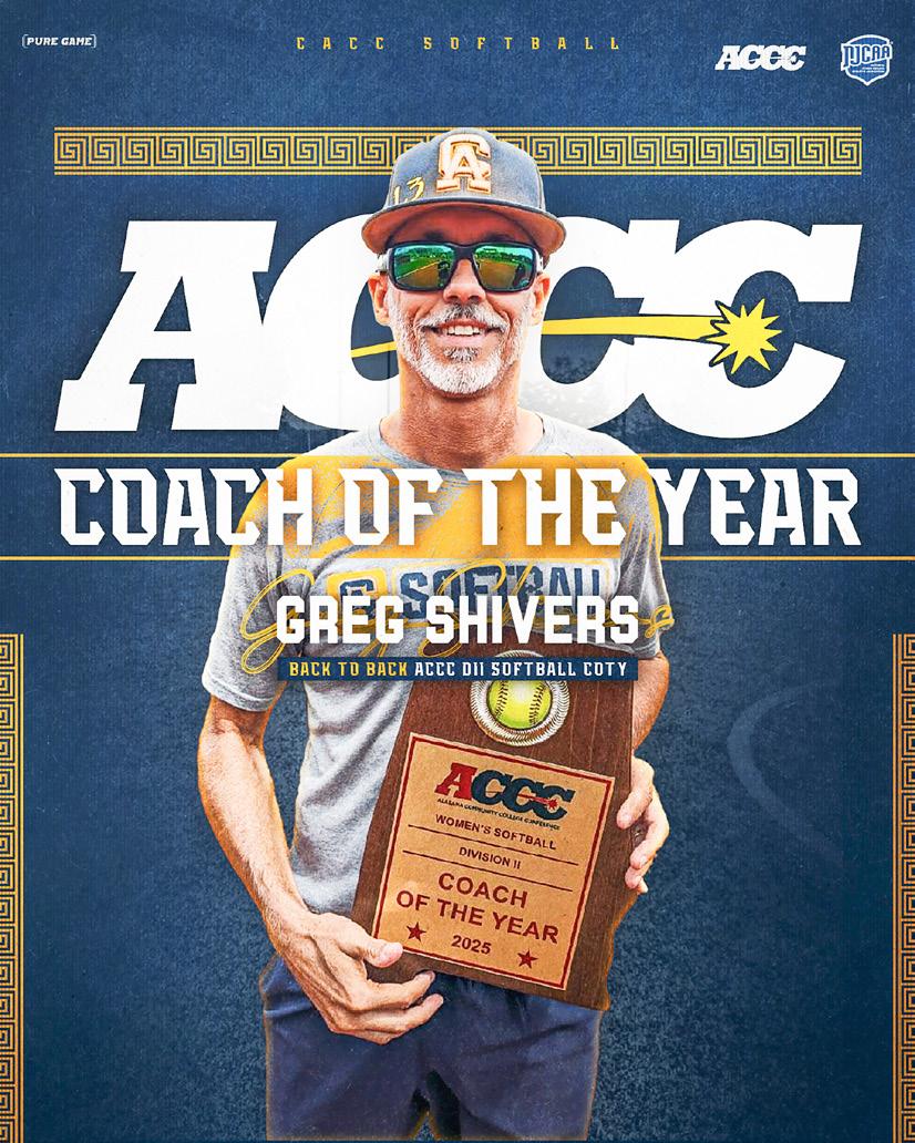 while ranking third in the Alabama Community College Conference. The softball team posted a 43-20 record, going 34-1 against conference opponents, all the while coach Greg Shivers was named the ACCC Softball Coach of the Year.