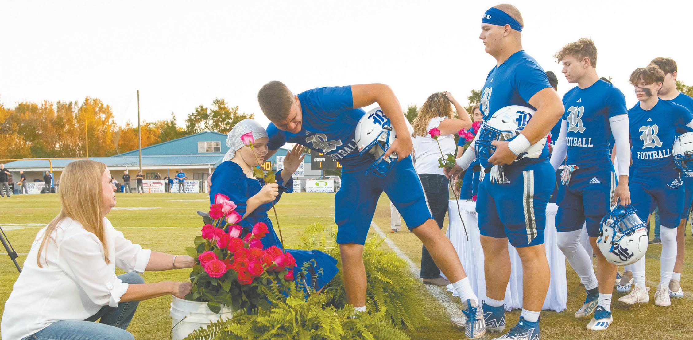 — they thought to have a better view. Melody took a seat and soon every Reeltown High School Rebel Pride band member, every Reeltown football player and even Luverne volunteer coach and pastor Chris Hale presented her with a pink rose — Melody’s favorite.
