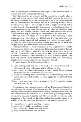 Seakeeping 533 value in assessing prediction methods. The longer the time period the better the measure of a ship's `average' performance. Short duration trials are expensive and the opportunity is usually taken to record hull strains, motions, shaft torque and shaft thrust at the same time. Increasing attention is being paid to the performance of the people on board. The sea state itself must be recorded and this is usually by means of a wave recording buoy. For the second type of trial a simpler statistical motion recorder is used, often restricted to measurement of vertical acceleration. No wave measurements are made but sea states are observed. Statistical strain gauges may also be ®tted. Satellites can be used to measure the wave system in which the trial ship is operating and can help record the ship's path. Although various methods have been proposed for measuring a multidirectional wave system it is a very di cult task. Good correlation has been achieved between calculated and measured sea loadings in some trials by applying the cosine squared spreading function proposed by the ITTC (see Chapter 9) to a spectrum based on buoy measurements. In the earliest trials the waves were recorded by a shipborne wave recorder but nowadays a freely ¯oating buoy is used. Signals are transmitted to the trials ship over a radio link or recorded in the buoy for recovering at the end of the trial. Vertical motions of the buoy are recorded by an accelerometer and movement of the wave surface relative to the buoy by resistive probes. Roll, pitch and azimuth sensors monitor the attitude of the buoy. For studying complex wave systems in detail several buoys may be used. A typical sequence for a ship motion trial is to: (a) carry out measured mile runs at the start of the voyage to establish the ship's smooth water performance and to calibrate the log; (b) carry out service trials during passage to record sample ship motions and propulsive data under normal service conditions; (c) launch the recording buoy, record conditions and recover buoy, when conditions are considered suitable, i.e. waves appear to be su ciently longcrested; (d ) carry out a manoeuvre of the type shown in Fig. 12.35 recording motions and waves for each leg. Figures denote time in minutes spent on each leg. The accuracy of the analysis depends upon the number of oscillations recorded. For this reason, the legs running with the seas are longer than those with ship running head into the waves. The overall time on the manoeuvre has to be balanced against the possibility of the sea state changing during the trial. The two sets of buoy records and a comparison of the results from the initial and ®nal legs provides a guide to the stability of the trial conditions. The remaining steps of the sequence are: (e) (f) (g) (h)