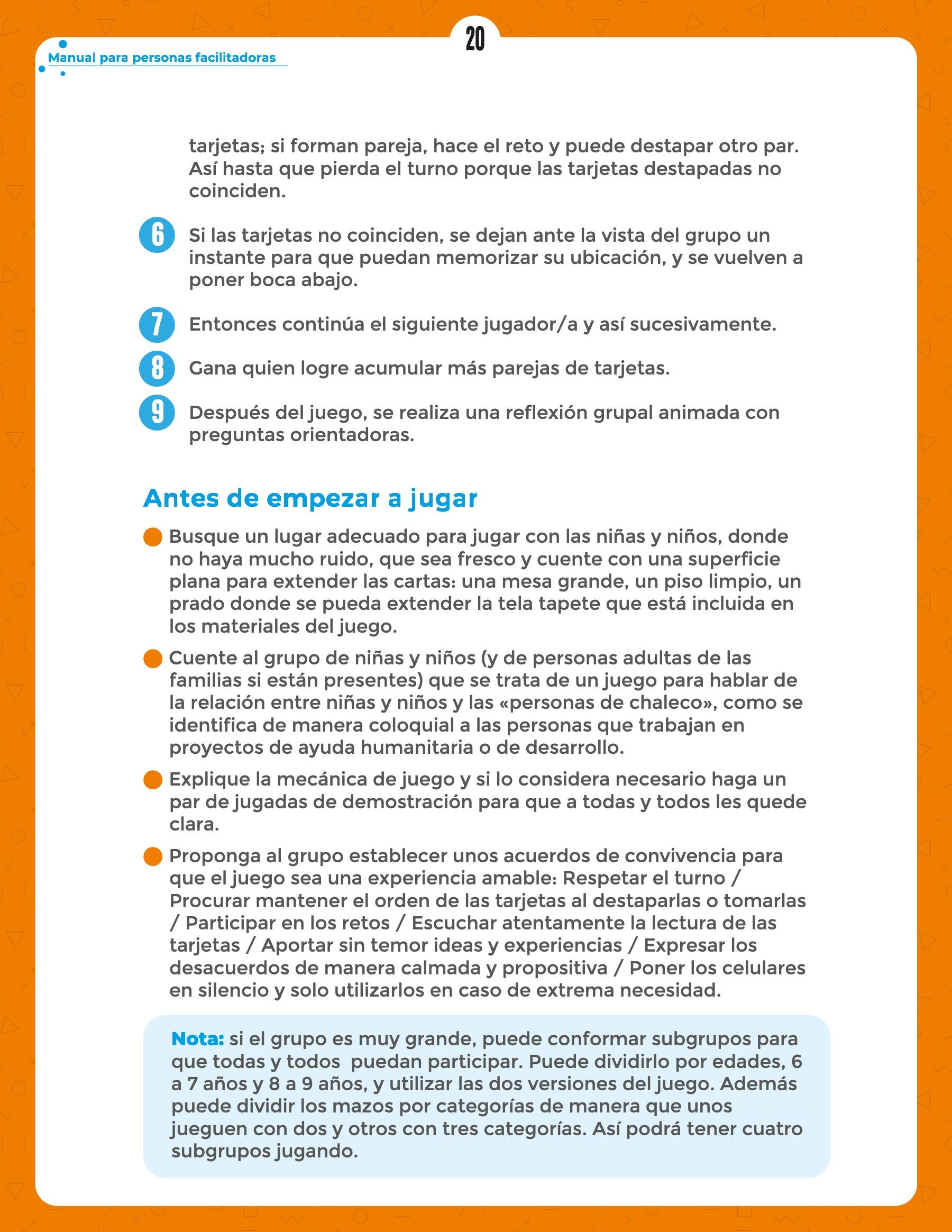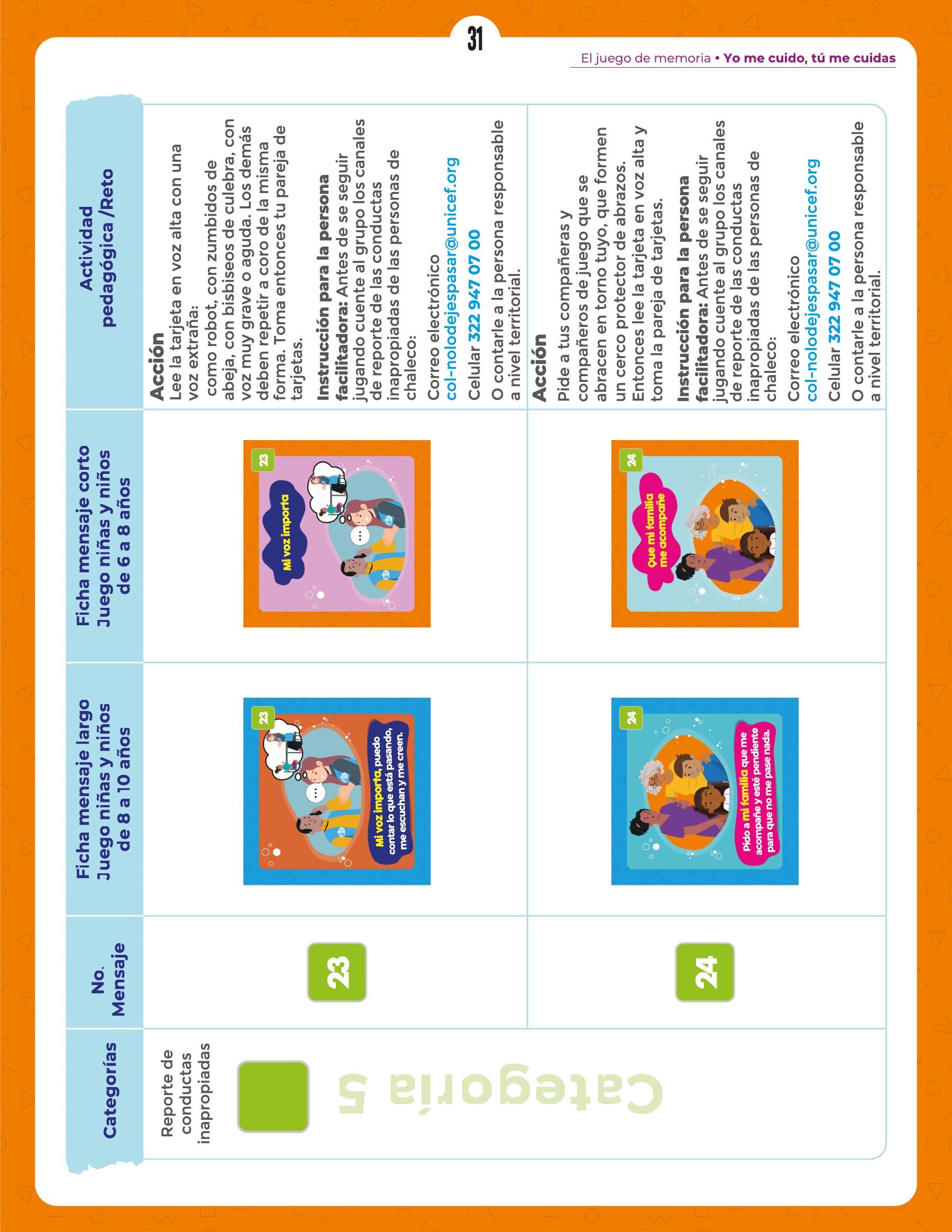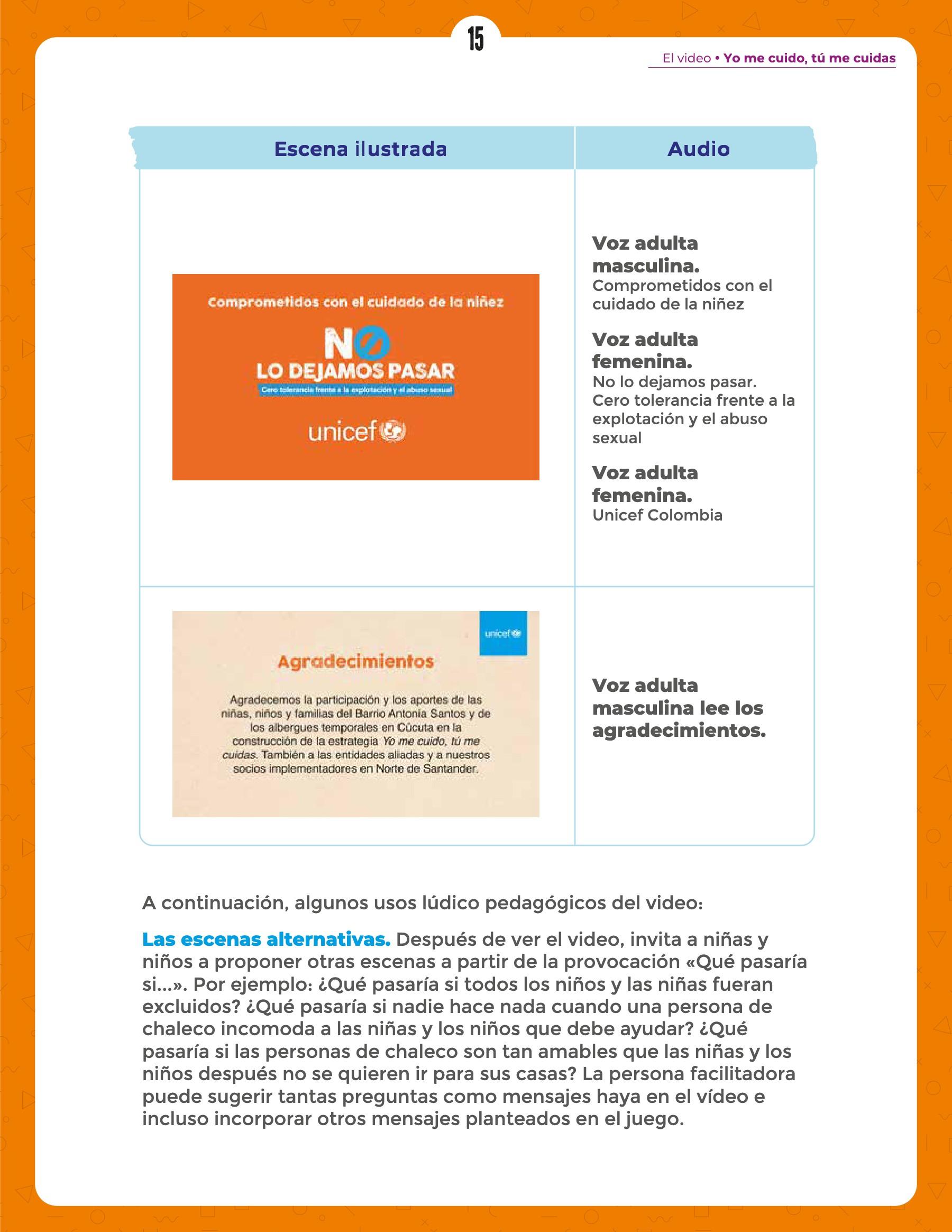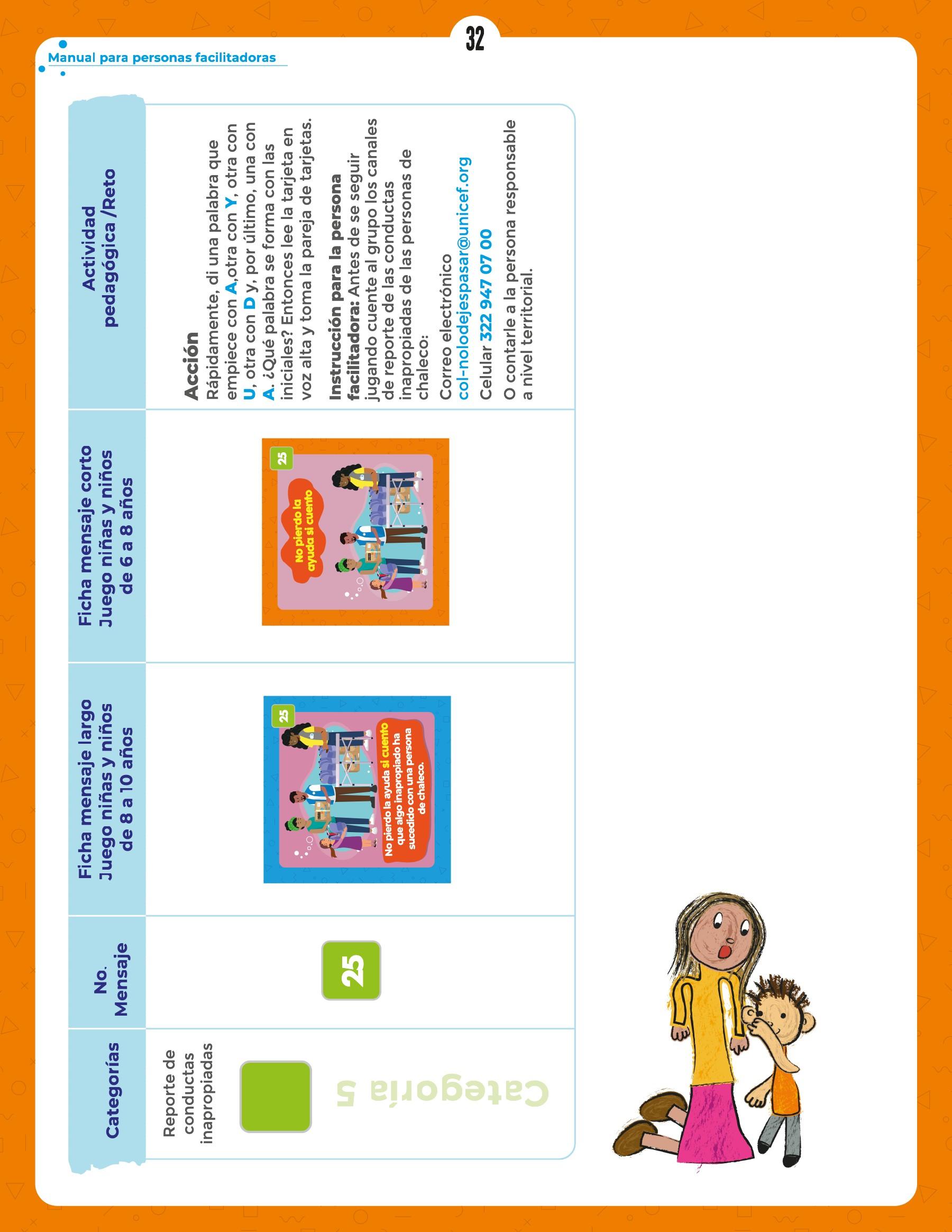 Manual para personas facilitadoras "Yo me cuido, tú me cuidas" dirigido a niñas y niños de 6 a 9 años como parte de la campaña de prevención y respuesta frente la Explotación y el Abuso Sexual de UNICEF Colombia, incluyendo contenidos de la Política de Salvaguarda de la Niñez de la organización.