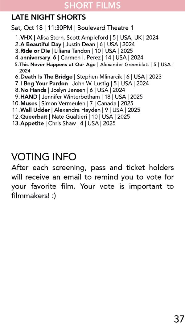 After each screening, pass and ticket holders will receive an email to remind you to vote for your favorite film. Your vote is important to filmmakers!