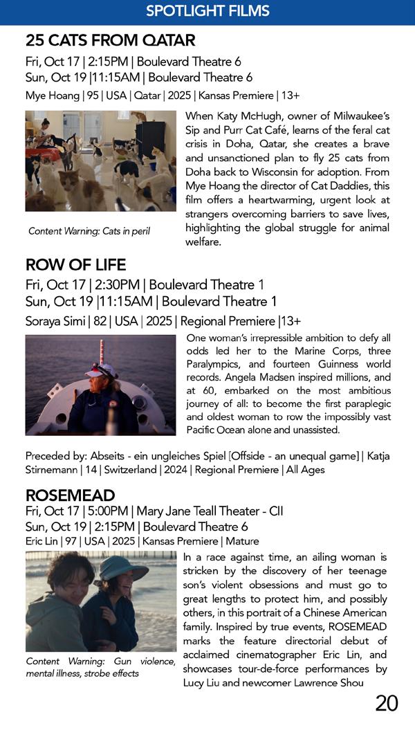 All in-person venues are ADA-accessible. Many films have open captioning. See the website for details, or contact accessibility@ tallgrassfilm.org. Quiet spaces are also available at some venues. Any other needs may be accommodated; just let us know.