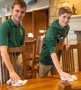 Dean of Students Jimmy Franklin gives merit points to juniors Timothy Beck and TJ Cox, as they wipe down the tables and push in all the chairs at the end of the third lunch every day. “It is not their job, they have not been asked to do it,” Franklin said. “They do it voluntarily.” Cox and Beck feel like it is the least they can do to help out the kitchen staff, who serve over 500 meals a day. “We just like to help out the lunch staff since they are some of the most hardworking people on campus,” said Cox.