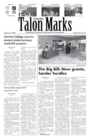 The Cerritos College Talon Marks is the student newspaper. Cerritos College is a public community college in southeastern Los Angeles County.