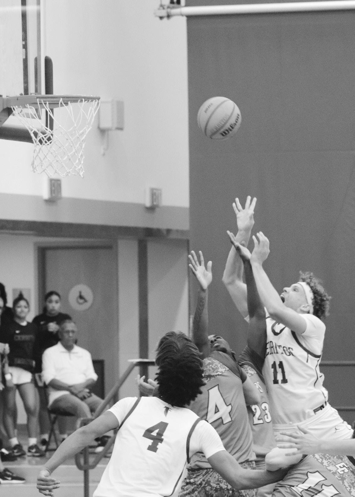 Both Guard DJ Holt and Forward Dorian Tate for Cerritos made their free throws to help the team take a 52-48 lead with 6:43