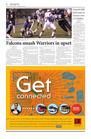 our losses to Palomar and LA Harbor,” Mazzotta said. The Falcons’ ground attack showed a 158yard difference over the Warriors. Running back Donald Livingston, along with other running backs, carried the ball due to the absence of the team’s leading rusher Thomas Gray. “We knew [Gray] was going to be down for the season, so we went out there and ran hard for him,” Livingston said, “the running backs and offensive line really stepped it up.” Livingston scored on a 10-yard run with less than two minutes left in the first half. The run came after the defense pushed the Warriors into their own endzone, resulting in a safety.