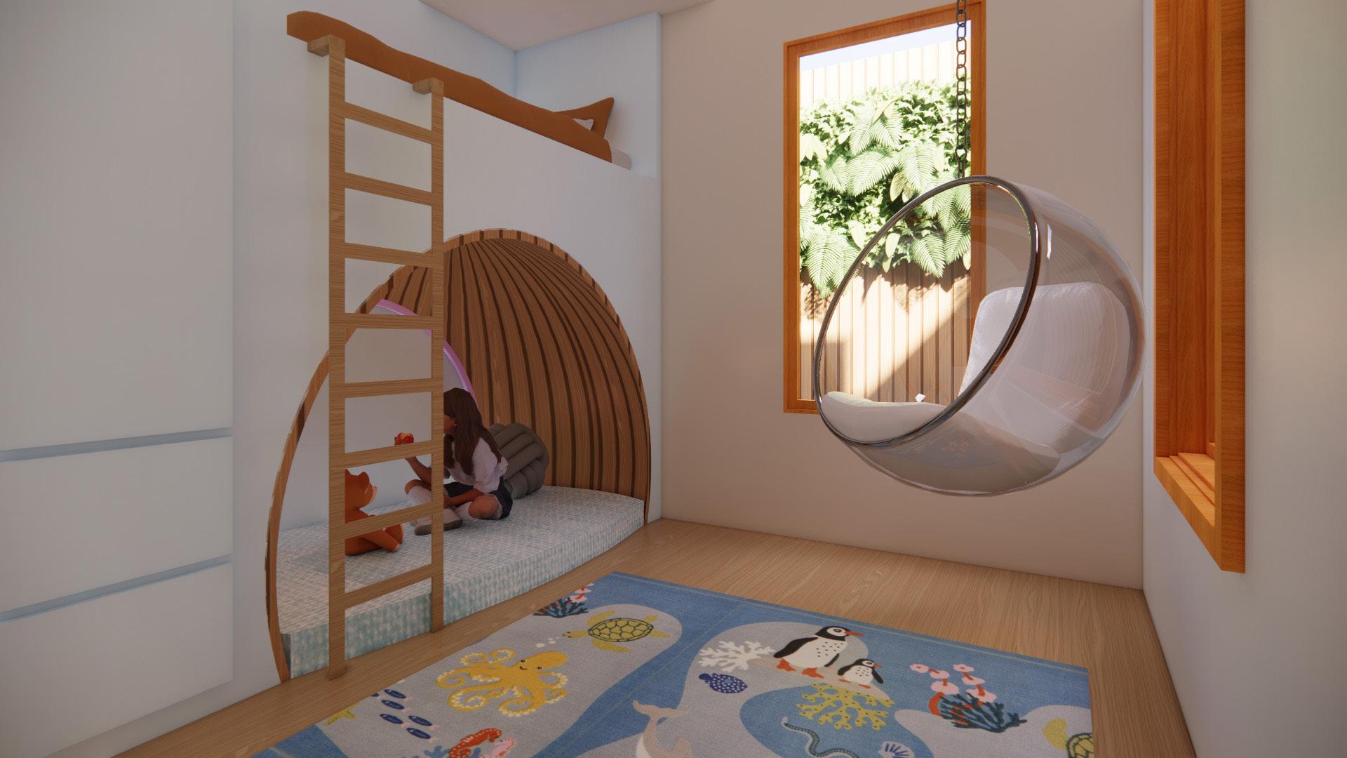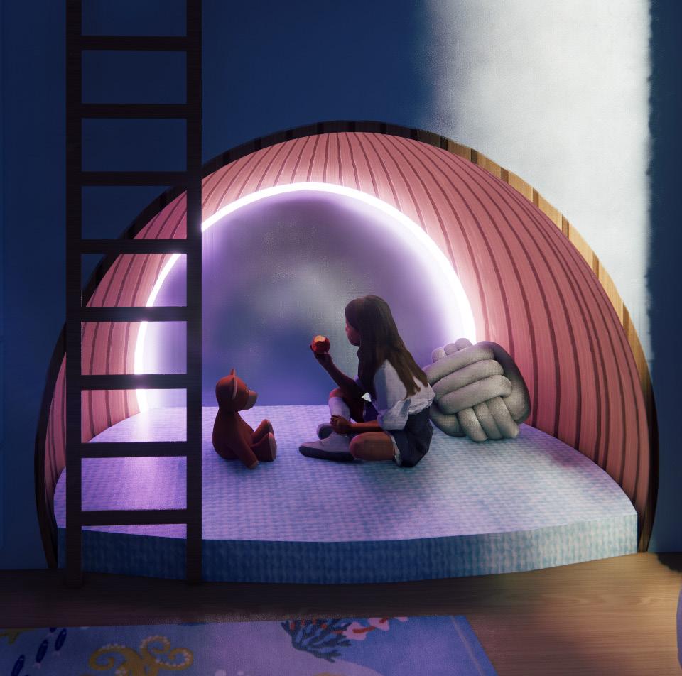 The child’s bedroom includes an “escape zone”- a small enclosed space that provides refuge in times of overwhelm and anxiety. This space focuses on compression and tactility in order to provide a sense of control. Additionally, color LED lighting provides a simple solution to visual adjustment that can be selfregulated by the child.