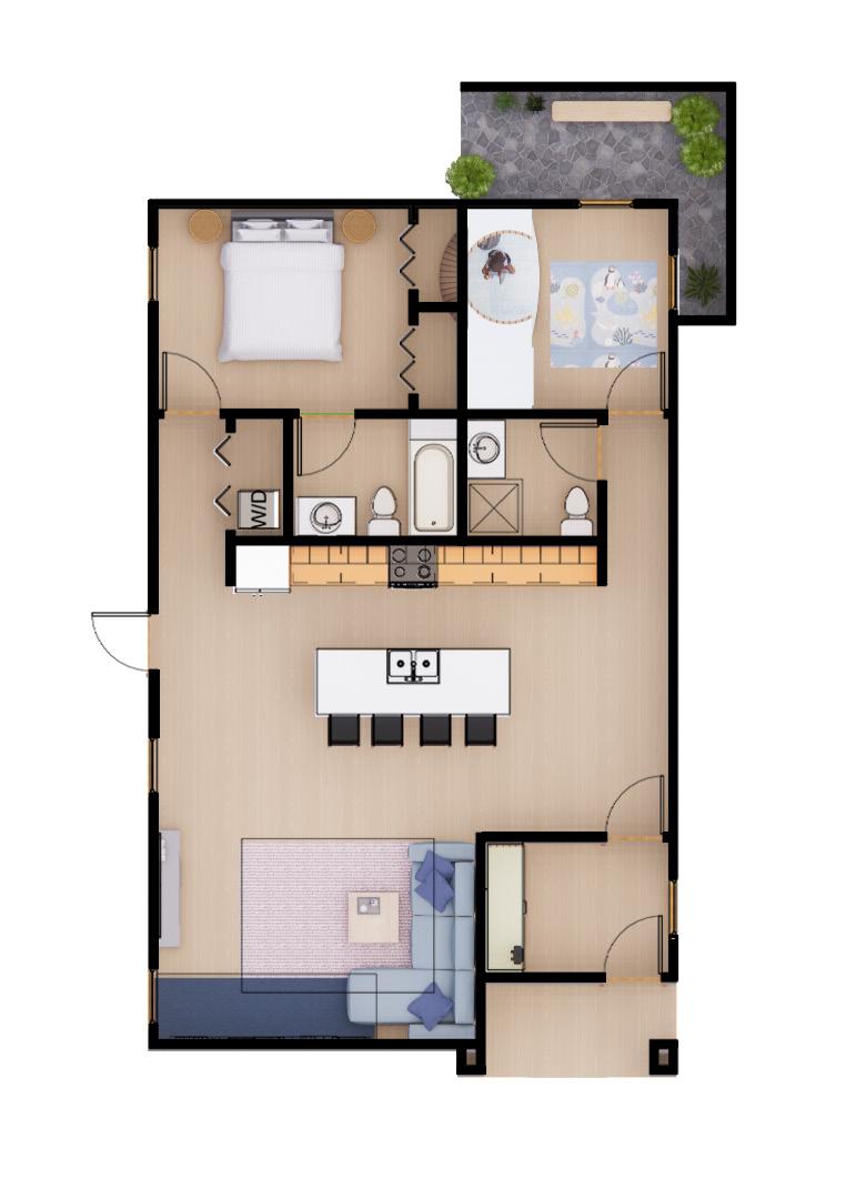 The bedroom is a private, low-stimulation zone, which includes soft colors, and solft acoustic materials. The window view of the green space increases relaxation and restoration.