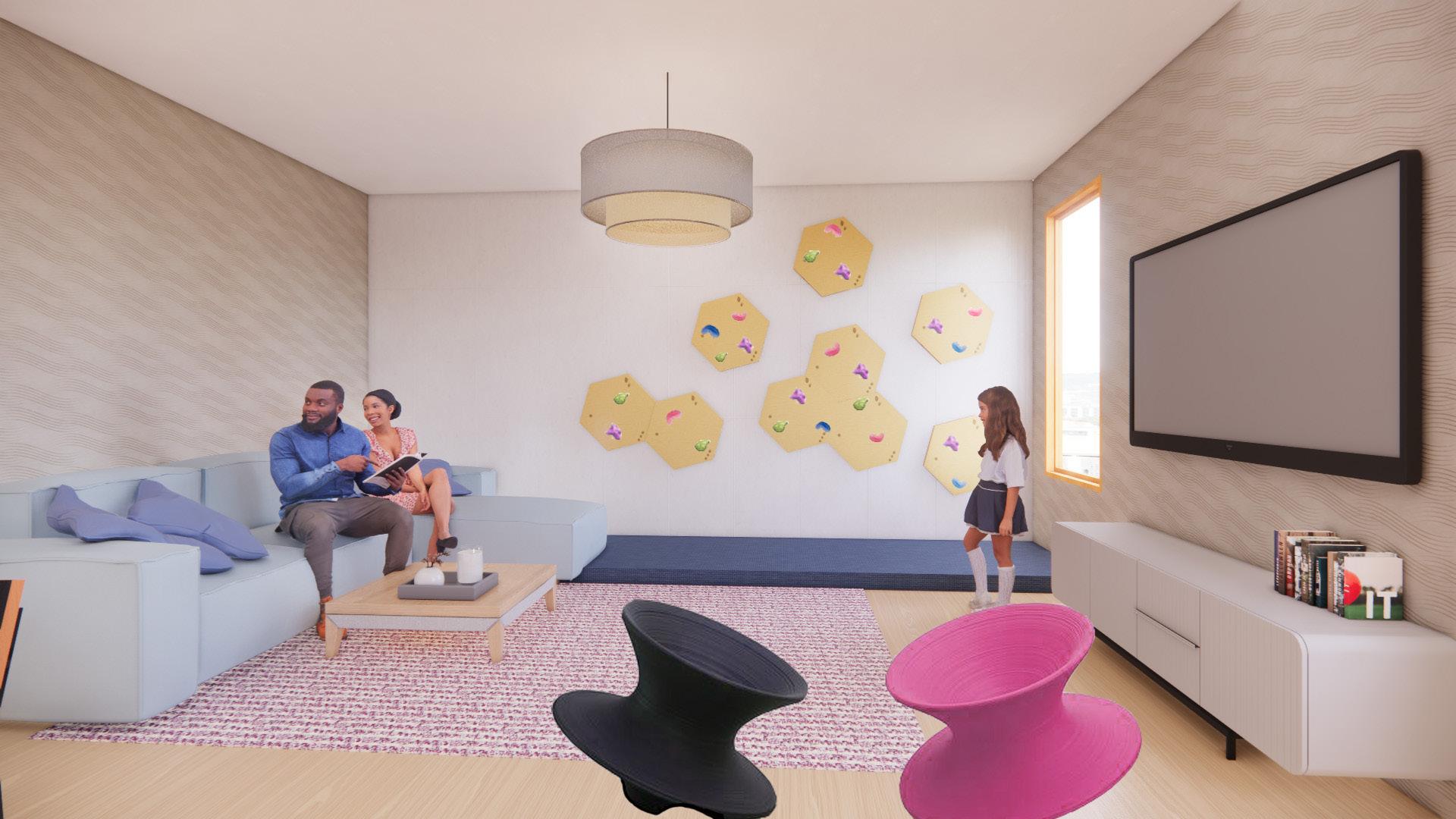 The living room, which is a high-stimulation shared space, includes a climbing wall feature and spinning chairs for the child to play, stim, and engage with their family and friends..