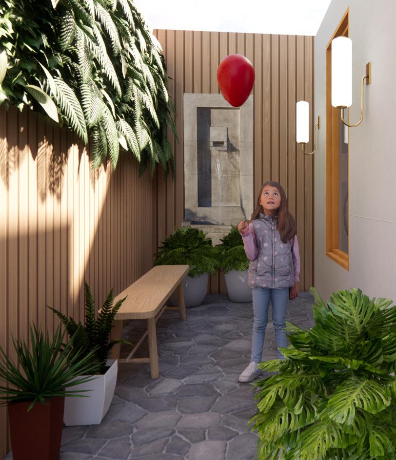 An enclosed green space outside the house gives children a place to engage with natural elements safely.