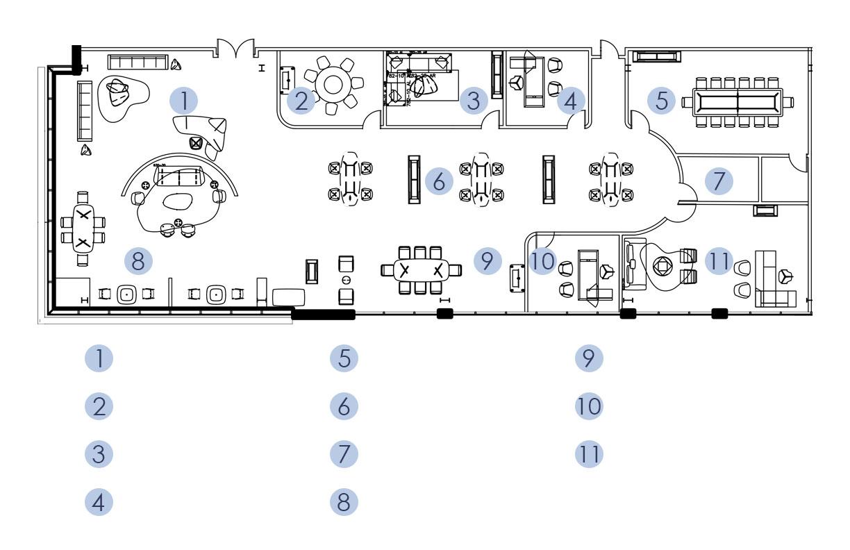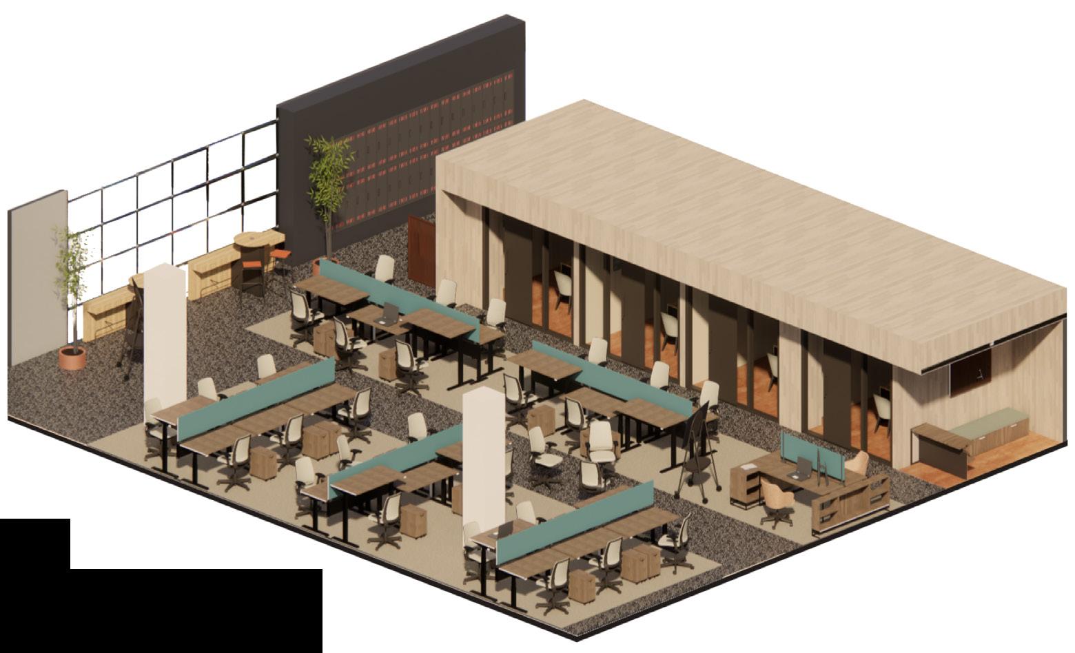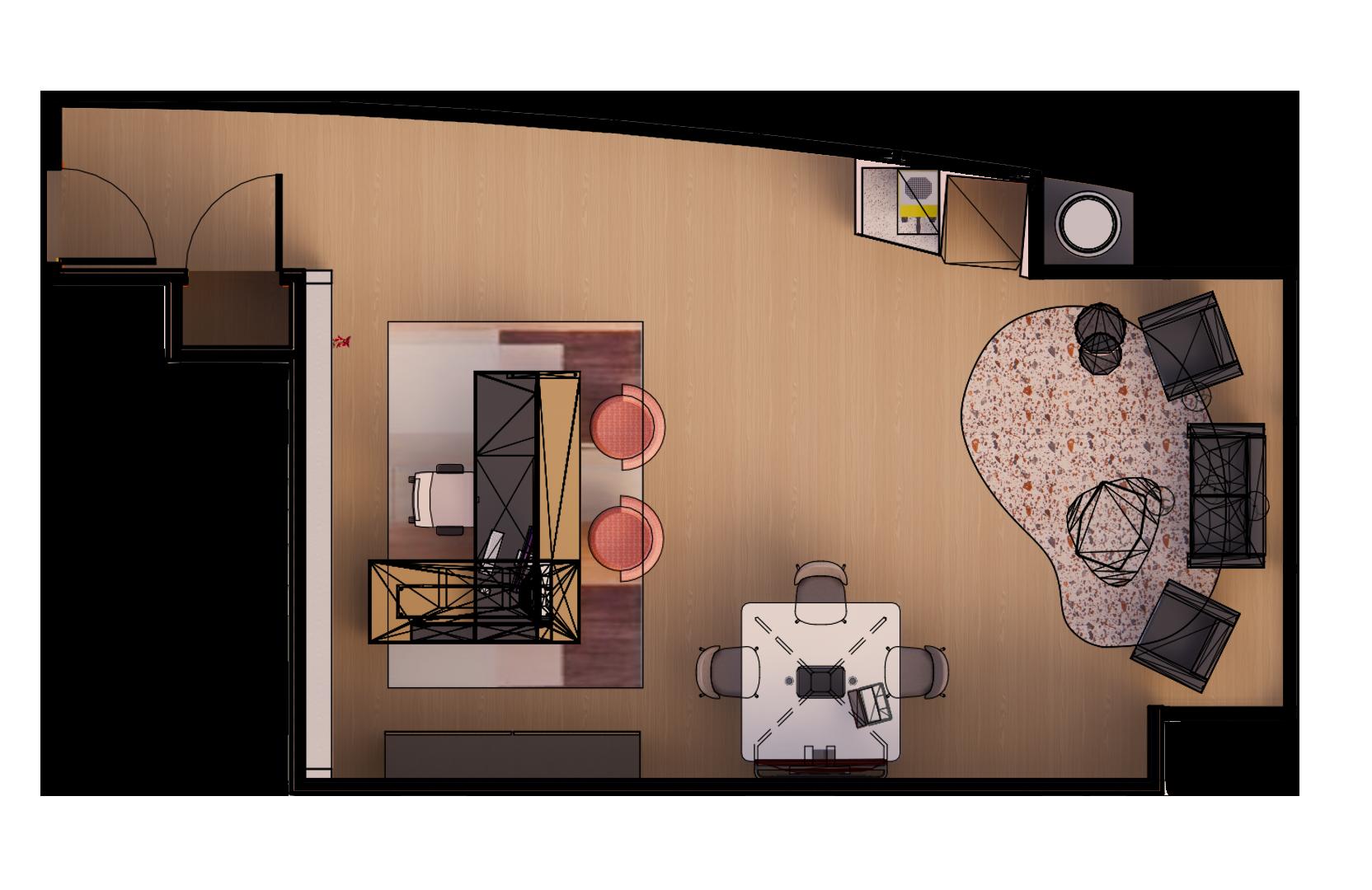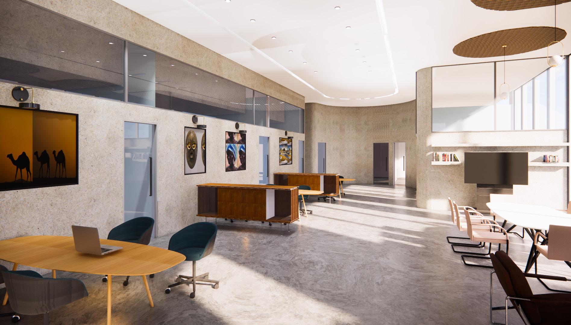 This design is for a South-Africa based business consulting firm. The client asked for a non-hierarchical workplace with a strong focus on African art and culture.