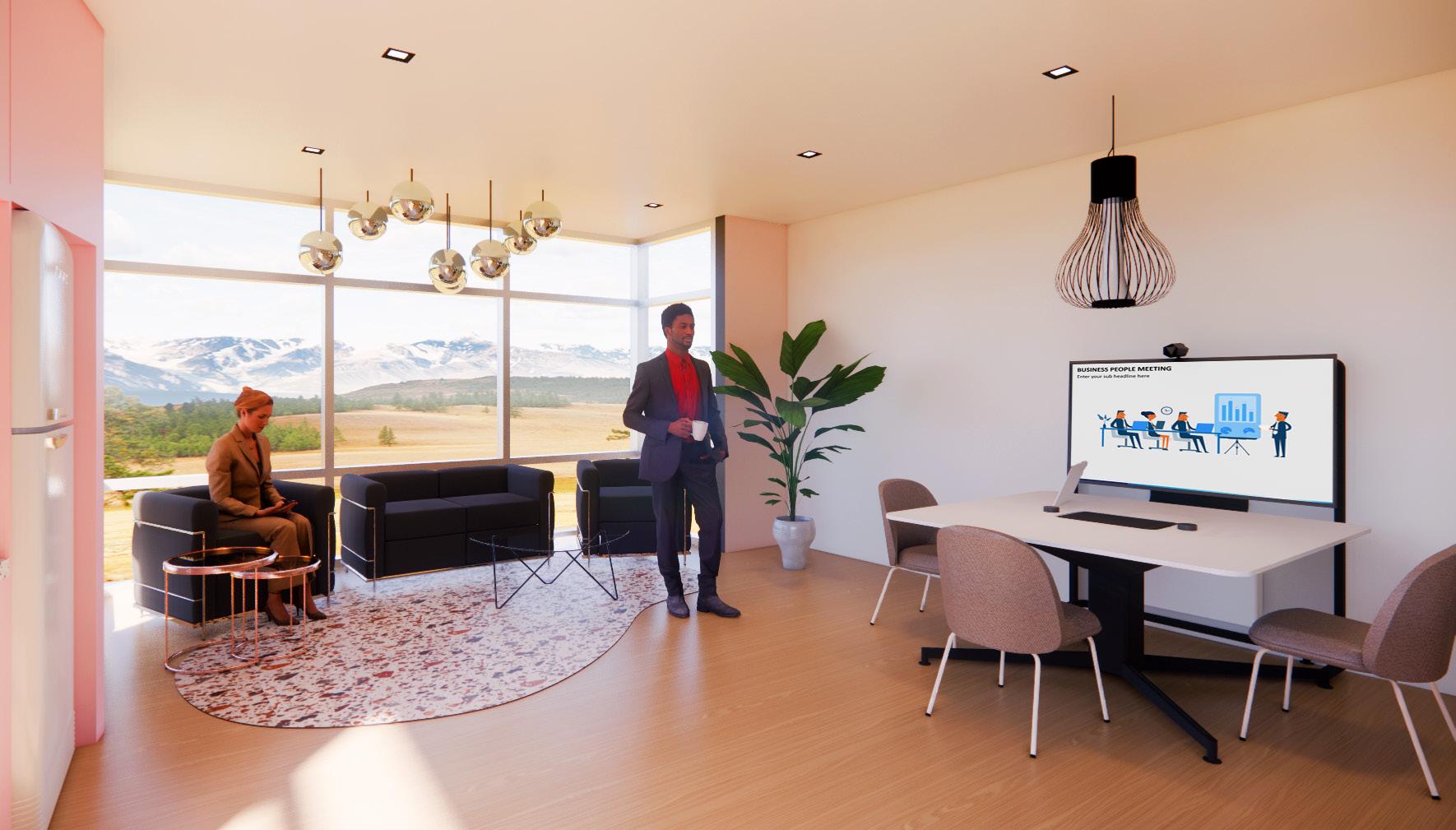 Features: executive desk, kitchenette, guest lounge, and small meeting area with media table.