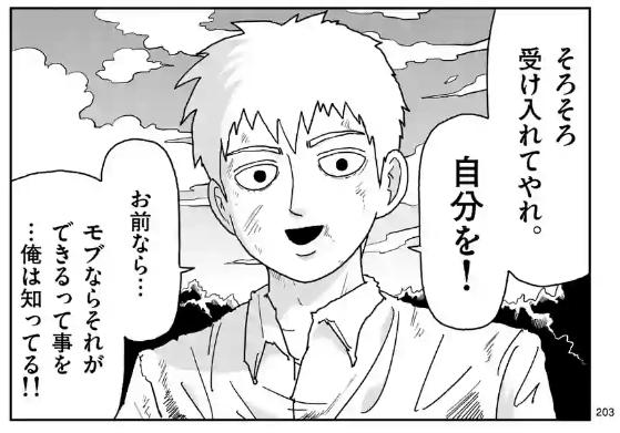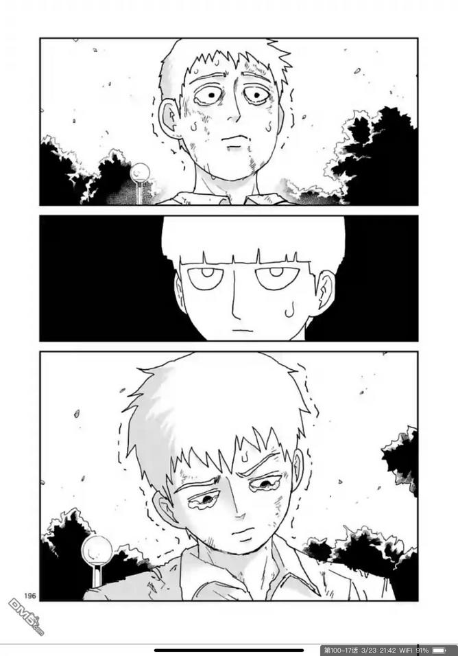 漫畫中印象深刻的⽚段 在漫畫第90話中,⾯對「⽖」的最終⽼⼤鈴⽊統 郎,路⼈奮⾾抵抗。此時,其他的夥伴都已經傷痕 累累,於是路⼈堅持要孤軍奮戰,不希望再有⼈受傷 了。 鈴⽊統 郎累積了⼆⼗年的⼒量,妄想靠著超能 ⼒統治世界。他認為超能⼒者天⽣就與沒有超能⼒的 普通⼈不同,是得天獨厚、更為⾼尚的存在,並且可 以成為掌握世界的中⼼。 但為了達成他的理想,他⾃⼰和路⼈夥伴們的家 鄉「調味市」已經被摧毀得⾯⽬全⾮,無辜的⼈們死 傷慘重,路⼈的朋友們也在對抗組織成員的戰⾾中, 差點丟失性命。 這已經使路⼈相當憤怒了。最⼤的爆發點是,在 與鈴⽊統 郎對峙的途中,靈幻新隆忽然出現,試圖 以他的⼝才, 服⽼⼤放棄⾃⾝的理想。靈幻主動以 拳頭出擊時,鈴⽊統 郎覺得⾃⼰被 了,於是使出 強⼤的⼒量,擊向⼿無⼨鐵的靈幻 路⼈的憤怒值,瞬間累積到100%。 除了路⼈爆發那瞬間的威迫感和張⼒之外,這段 令⼈印象深刻的原因之 ,是路⼈終於打定主意,放 棄⽤⾔語 服眼前的男⼈。此後,也證實了路⼈的戰 ⾾⼒在本作中,是最強的。 統帥超能⼒軍團的⽼⼤,苦⼼積累⼆⼗年的⼒ 量,竟在路⼈的怒⽕、以及想守護調味市和整個世界 的決⼼之下,全數化為 無。 這也是本作想傳達的重點 不能因為擁有超能 ⼒⽽⾃視甚⾼,每個⼈都有各⾃的潛能,以及擅⻑的 領域。 靈幻作為 個普通⼈,卻有勇氣獨⾃前往路⼈和 ⽼⼤戰⾾的最前線。他何嘗不害怕?但他知道他必須 去,阻⽌路⼈的⼜ 次爆發,也需要把這些話語傳達 給鈴⽊統 郎: 「你的眼中只有那 『看不⾒的⼒量』,可悲的 ⼈是你啊。」 「⼈擁有的優秀⼒量並不只限於超能⼒。」 漫畫第90話 4