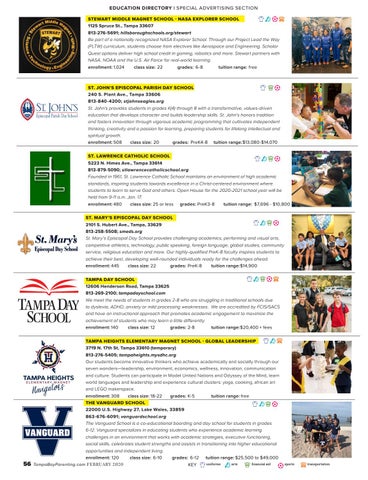TAMPA HEIGHTS ELEMENTARY MAGNET SCHOOL - GLOBAL LEADERSHIP 3719 N. 17th St, Tampa 33610 (temporary) 813-276-5405; tampaheights.mysdhc.org Our students become innovative thinkers who achieve academically and socially through our seven wonders—leadership, environment, economics, wellness, innovation, communication and culture. Students can participate in Model United Nations and Odyssey of the Mind, learn world languages and leadership and experience cultural clusters: yoga, cooking, african art and LEGO makerspace. enrollment: 308 class size: 18-22 grades: K-5 tuition range: free THE VANGUARD SCHOOL 22000 U.S. Highway 27, Lake Wales, 33859 863-676-6091; vanguardschool.org The Vanguard School is a co-educational boarding and day school for students in grades 6-12. Vanguard specializes in educating students who experience academic learning challenges in an environment that works with academic strategies, executive functioning, social skills, celebrates student strengths and assists in transitioning into higher educational opportunities and independent living. enrollment: 120 class size: 6-10 grades: 6-12 tuition range: $25,500 to $49,000 uniforms arts financial aid TampaBayParenting.com FEBRUARY 2020 KEY