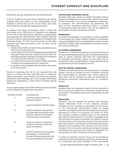 ST UD ENT COND UC T A ND D I SCIPLIN E homework, games and sleep will not be permitted. A list of students who have been assigned a DH will be available each day. While it is the responsibility of the student to check the list, the Dean’s office will make every effort to contact the assigned students. In addition, the Dean of Students holds a Friday DH each week from 3:35-5:05 p.m. Students are assigned to this DH by the Dean when deemed an appropriate consequence to a rule infraction. Also, students who fail to serve a DH in a week will be assigned a Friday DH the following Friday. This DH must be served on the date assigned and takes precedence over all other school commitments. • Middle School DHs are held in the computer hub on the first floor during lunch. • In the Upper School, DH is held during lunch Monday through Friday and after school from 3:35-4:05 p.m. Monday through Thursday. If a Friday DH is assigned, it is held from 3:35-4:05 p.m. on Fridays. • Lunchtime DH is held in the library. After school DH is held in the assigned proctor's classroom. • A student must complete the DH within one week of its assignment. Failure to complete the DH in the required time will result in a Friday DH from 3:35-5:05 p.m. A Friday DH takes precedence over all other commitments (sports, rehearsals, club meetings, etc.) and a student will not be allowed to participate in after-school activities during that time. Accumulated Upper School DHs will be treated according to the following schedule (per semester): Number of DHs 2