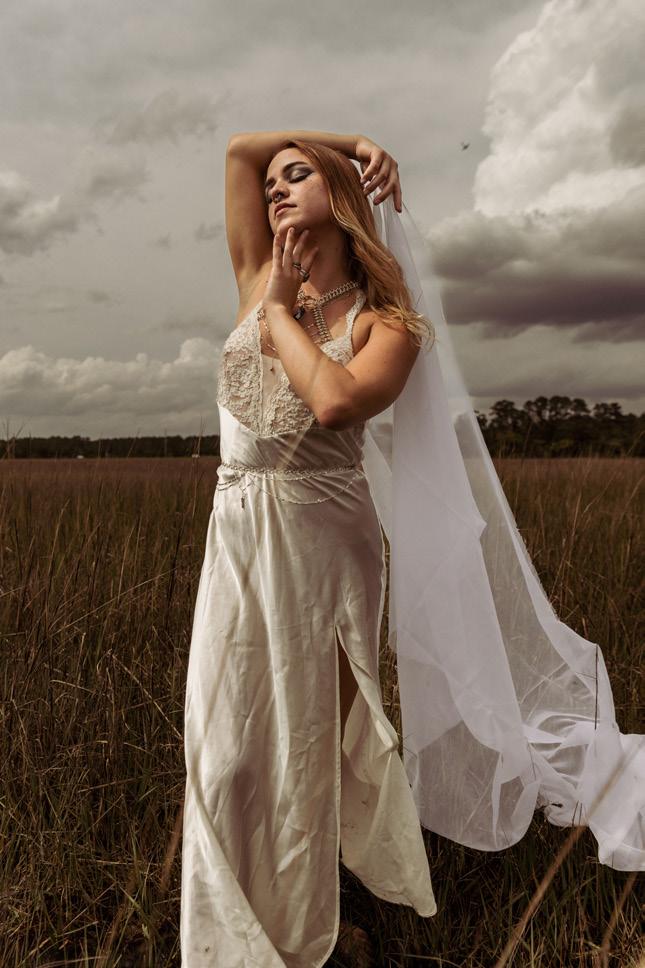 mi capacidad para moverme hacia adelante y hacia atrás y poder capturar toda la escena a 24 mm, y luego, sin tener que cambiar mi posición ni la de las modelos, hacer zoom para obtener hermosos primeros planos. Me encanta poder lograr tal variedad de imágenes con un solo objetivo. Ese ligero aspecto de gran angular en el extremo de 24 mm le da un toque de moda a mis retratos. Sin importar a qué distancia focal esté, mis imágenes son nítidas y enfocadas. La iluminación para esta sesión fue completamente natural, con un reflector para rebotar la luz. La imagen principal aquí en la que el reflector jugó un papel importante es la de mi amiga con el vestido negro y el velo sobre su rostro. Estaba completamente retroiluminada en esa escena, así que quería que el reflector rebotara la luz en ella. El efecto del velo fue una especie de abstracción, destinado a mostrar cómo su rostro está completamente cubierto, pero aun así visible.