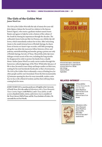 The Girls of the Golden West tells the tale of ninety-five-year-old John Quincy Adams the Second (no relation to the famous historic figure), who meets a graduate student named Annie Baxter and agrees to help her write a history of the culture of the South by sharing his experiences through the decades. The redheaded Annie looks just like Liz Denney, one of John Q.’s old lovers, which immediately endears her to him. After welcoming Annie to the small, fictional town of Bodark Springs, he shares hours of stories on Annie’s tape recorder, with little prompting along the way. John Q.’s memories follow histories of love and jealousy, misunderstanding and murder, giving a picture not only of Bodark Springs, but also of Texas. Meanwhile, John Q.’s inner dialogue reveals secrets of his own, including the long months he disappeared in order to protect his family from a deadly threat. Author James Ward Lee easily carries readers through this humorous cultural pilgrimage of the West. While John Q.’s pace of life is slow, his mind is razor sharp and keeps readers on their toes, waiting for his next harmlessly bawdy joke or flare of seriousness. The Girls of the Golden West is ultimately a story of finding love for other people and for one’s homeland. From the first moment John Q. bemoans opening his door for nosy townsfolk, readers come face-to-face with a blend of wisdom and fun that will keep them coming back for more. JAMES WARD LEE is emeritus professor of English at the University of North Texas. He is the author of Adventures with a Texas Humanist, Texas Country Singers (with Phil Fry), and A Texas Jubilee, as well as over a hundred articles, stories, and reviews. Lee is a member of the Texas Literary Hall of Fame and the Texas Institute of Letters. He currently lives in Fort Worth.