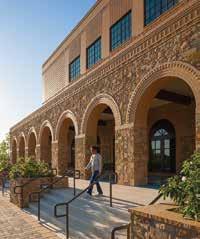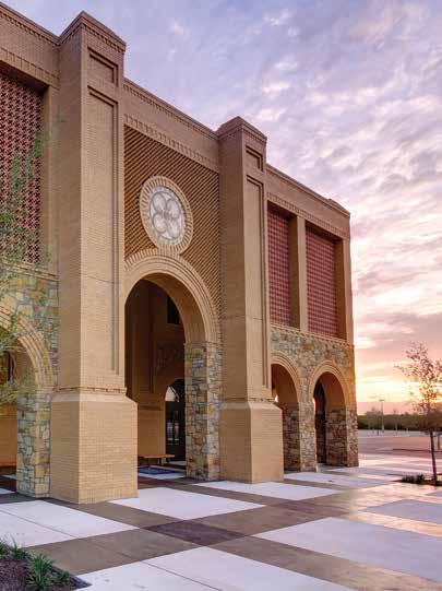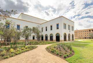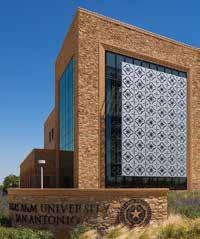 ABOVE: The Senator Frank L. Madla Building was the first building constructed on campus. The $30 million, 90,347-square-foot structure opened in 2011 and helped establish the University’s architectural style, with intricately detailed brickwork and San Saba sandstone, an homage to San Antonio’s historic missions.