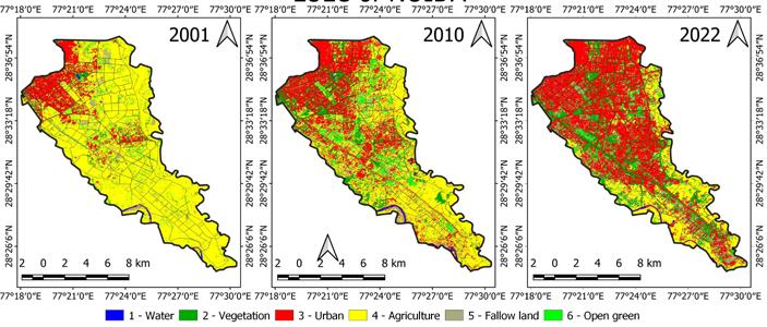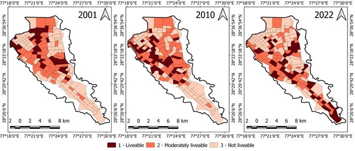 2022) URBAN LIVEABILITY INDEX (ULI) (2010 - 2022) 0.70 4.65 26.61 152.94 5.18 8.72 1.10 21.80 58.77 97.99 6.97 12.16 0.63 28.56 97.33 46.83 15.76 9.67 0 20 40 60 80 100 120 140 160 180 Water Vegetation Urban Agriculture Fallow land Open green Area (sq.km.) LULC area statistics 2001-2022 2001 2010 2022 0.20% 8.63% 16.18% -27.64% 0.90% 1.73% -30.00% -20.00% -10.00% 0.00% 10.00% 20.00% Water Vegetation Urban Agriculture Fallow land Open green % LULC Change 2001-2010 -0.24% 3.40% 19.40% -25.73% 4.42% -1.25% -30.00% -20.00% -10.00% 0.00% 10.00% 20.00% 30.00% Water Vegetation Urban Agriculture Fallow land Open green % Change 2010-2022 ATM Bank Bar Bus stop Communi y cen re Fue /cha g ng stat on Hosp ta /hea hca e Hote /homes ay Inst tut on Me ro sta on O f ce Pa k ng space P ace o worsh p Po ce sta on Post o f ce Pub c to e Restaurant cafe Shops/ma ketp ace Sports/stad um St eet ght Tou sm a trac on LEGEND ATM Bank Bar Bus stop Commun ty centre