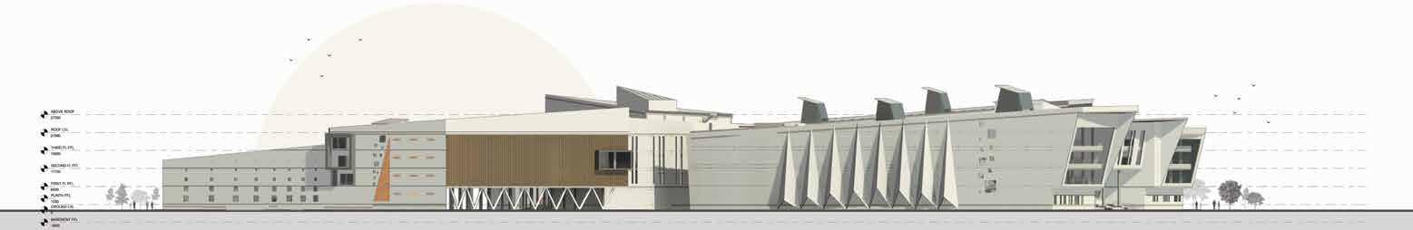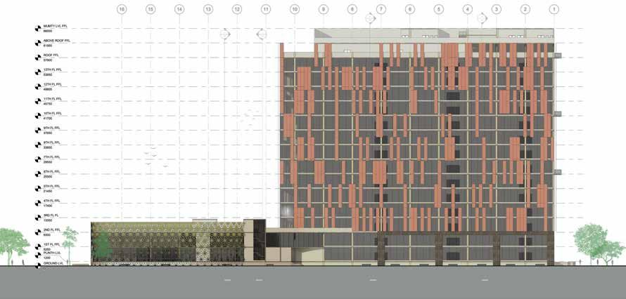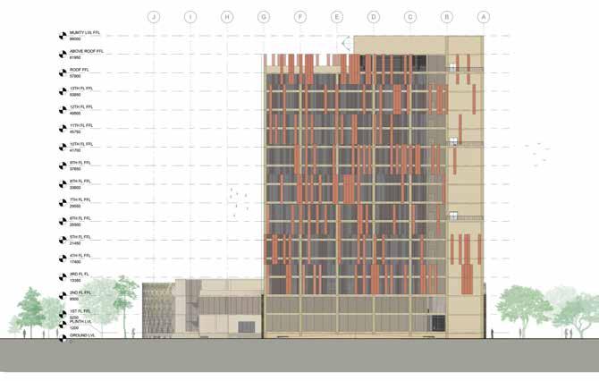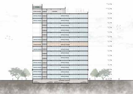 15 WEST FACADE 30% OPENING SOUTH FACADE 60% OPENING EAST FACADE 75% OPENING 36 MM THK POWDER COATED ALUMIIUM PANEL METAL HOLDER 300 HVAC DUCT HVAC DUCT HVAC DUCT 50 MM FINISH FALSE CEILING TYPICAL FLOOR FFL. TYPICAL FLOOR FFL. TYPICAL FLOOR FFL. 4050 4050 HEAT STRENTHEN GLASS @63MM THK 200 THK. SLAB POWDER COATEDD ALUMUNIUM LOUVRE @36MM THK 300 SPIDER JOINT 450X750 BEAM FALSE CEILING HEAT STRENGTHEN GLASS @63MM SINGLE MODULE- 750MM EQUILATERAL TRIANGLE HORIZONTAL ARRANGEMENT VERTICAL ARRANGEMENT PLINTH LVL FFL. +1350 SSL. +1300 GROWING MEDIUM ENGINEERED SOIL @100MM FILTRATION LAYER @75MM PERFORRATED SOILD HOLDING LAYER @150MM WATERPROOF LAYER @75MM DRAINAGE (150DIA PIPE) GROUND LVL LVL ±00 DRAIN GRATING @300MMDEPTH SITE DRAIN 300 450 BASEMENT ROAD SLAB @150MM REMOVABLE PLUG PIPE HOLDING CLAMP ROOF LVL BERM TO SUPPORT TREE COPING STONE DRIP COURSE DRIP COURSE 300 DRAIN PERFORRATED SOILD HOLDING LAYER @150MM GROWING MEDIUM ENGINEERED SOIL @100MM FILTRATION LAYER @75MM WATERPROOF LAYER @75MM SLAB @200MM REMOVABLE PLUG PIPE HOLDING CLAMP RAIN WATER PIPE @150MM DIA ROOF LVL FFL. varies SSL. +57850 BERM TO SUPPORT TREE COPING STONE DRIP COURSE DRIP COURSE HVAC DUCT HVAC DUCT FALSE CEILING 300 DRAIN PERFORRATED HOLDING LAYER GROWING MEDIUM ENGINEERED SOIL @100MM FILTRATION LAYER @75MM WATERPROOF LAYER @75MM SLAB @200MM SIDE ELEVATION COURTYARD DRAINAGE DETAIL ROOF AND PARATET DETAIL ROOF SECTION DETAILS TYPICAL SKIN SECTION REAR ELEVATION INCREASING OPENING SIZE