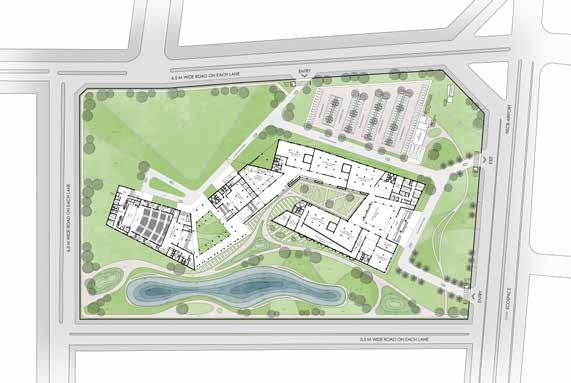 Residential towers placed at the rear end of the site to minimize noise from nearby industrial areas.