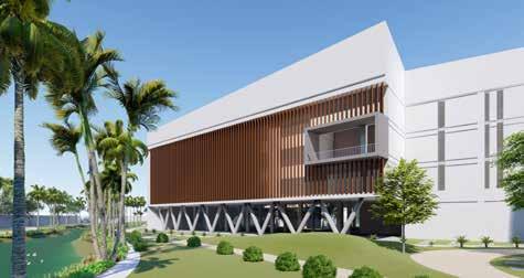 The G+13 storey office building is designed with an optimized ACP louvre system to lower direct heat gain.