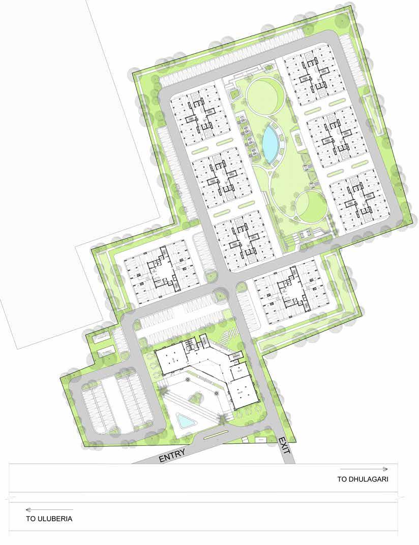 The objective is to design a resedential, co-living cum commercial complex in a 3.2 acres (13,000 sq.m.) site in Panchla, Howrah district, West Bengal.