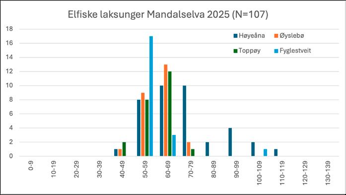 Elfiske i Mandalselva og Høyeåna 29.05.2025 vist som antall fisk fordelt på lengdeklasser i mm.