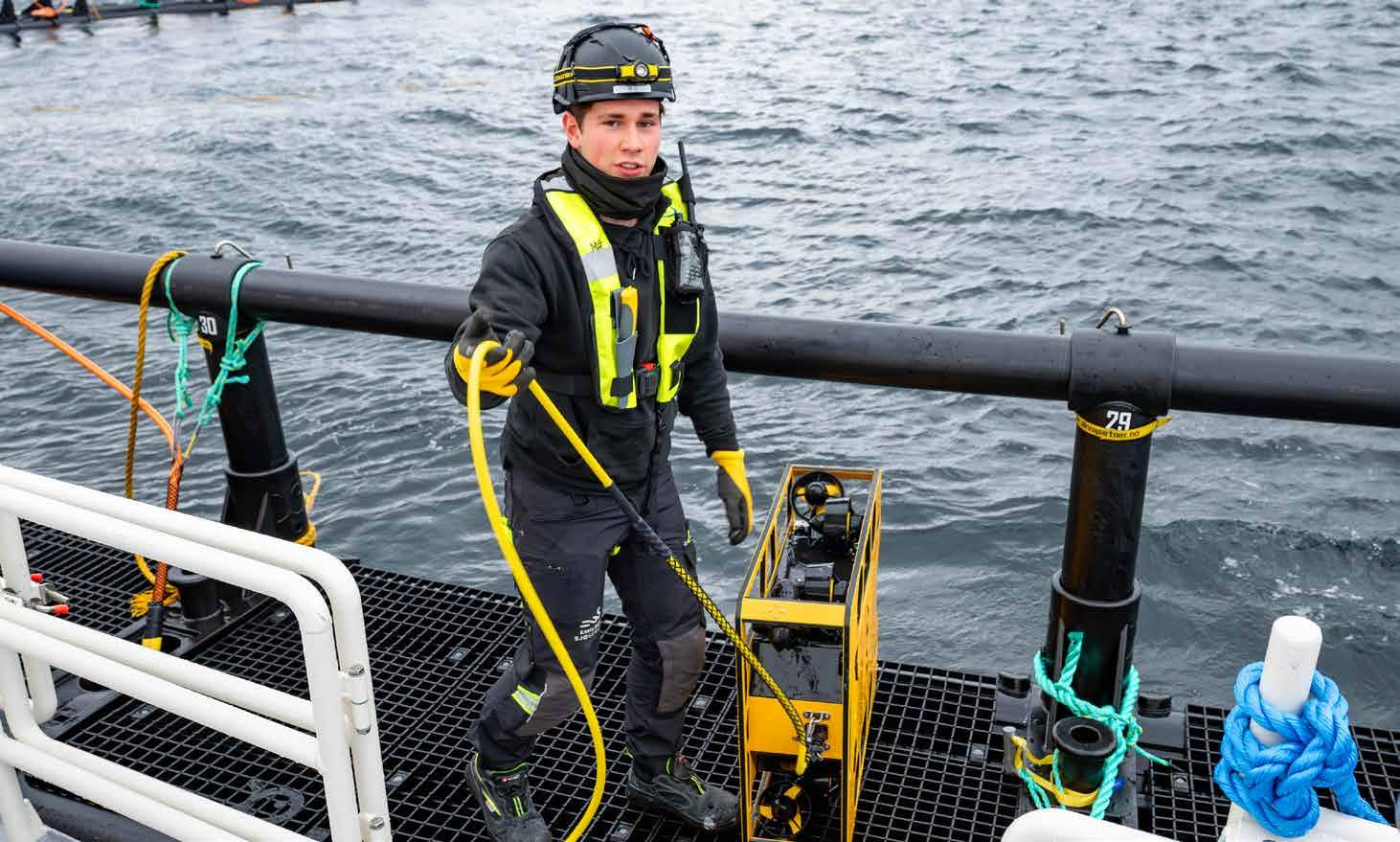 Til venstre: ROV-fartøyet «Ada» er arbeidsplass for Magnus og Victor. Ved hjelp av undervannsroboter sjekker de regelmessig alle fiskemerdene for å sørge for at laksen har det best mulig.