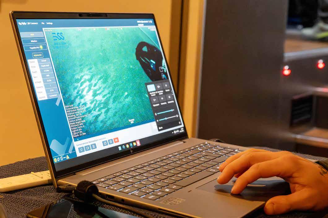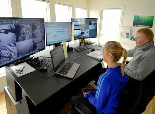 Til høyre: ROVen sender TV-bilder til dataskjermer om bord. Ved hjelp av ROV kan merdene sjekkes effektivt.