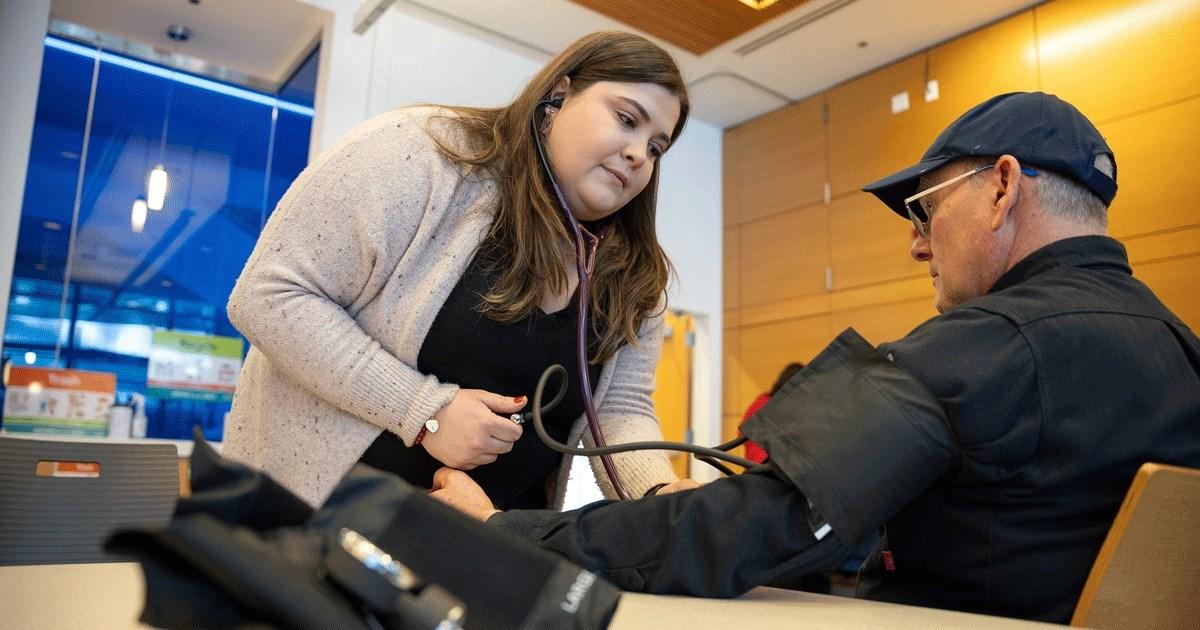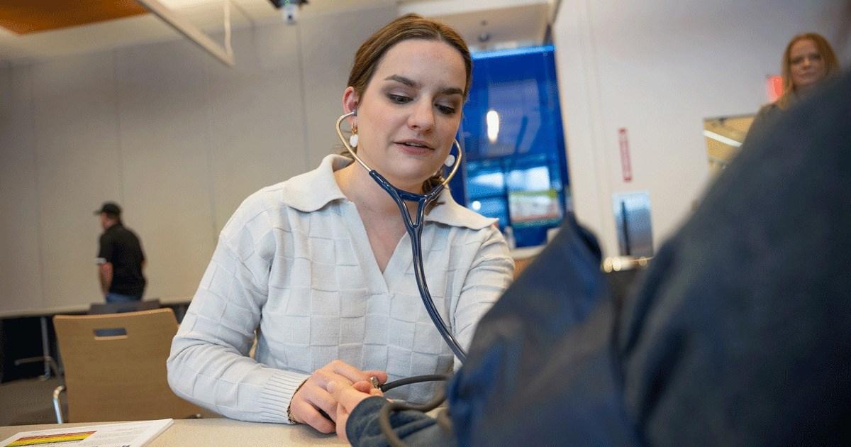 Marisa DaSilva, Grace Milone and Chikodiri Ebe, DNP 3 students in the Tan Chingfen Graduate School of Nursing offered FREE blood pressure screenings on Wednesday, Feb. 14 and 21. There was also complete a step test, CPR/first aid demos for people and pets, you could meet Sprite the therapy dog and get information from the Office of Well-Being.