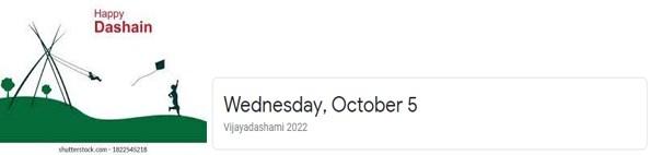 HISTORY OF DASHAIN Also called ‘Bijaya Dashami,’ Dashain is celebrated by Nepalese people, both within and outside the country. Centered on the worship of the goddess ‘Durga,’ thousands of offerings and animal sacrifices are made. The significance of the festival is the triumph of good over evil, commemorating a victory of the gods over the wicked ones. Read more: DASHAIN October 5, 2022 National Today