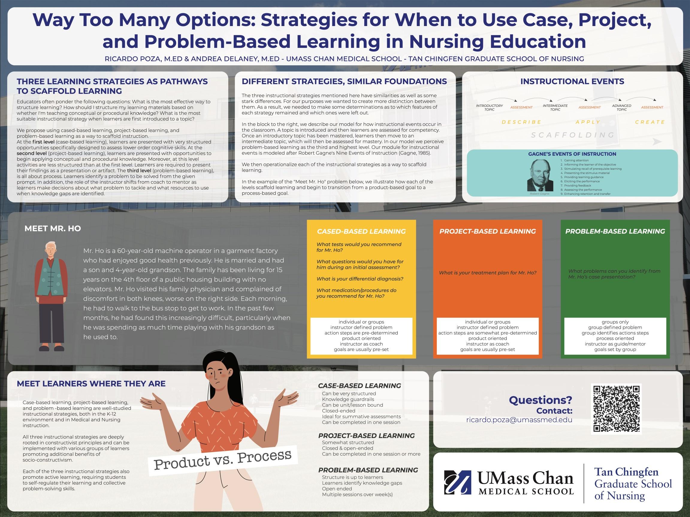 The concept for the poster originated from a Lunch and Learn session they conducted during this past summer series. The foundational principle is to offer faculty a user friendly framework that will help them quickly decide when to use case based, project based and problem based learning instructional strategies as a way to scaffold learning in Nursing Education. Inspired by Robert Gagne’s Nine Events of Instruction model, the key concept is to leverage each of the instructional strategies individually based on the desired outcome for the learning experience. The range of strategies vary from highly structured (starting with case-based learning), to less structured (and more conceptual (project based learning), and progress to flexible and open structure with a focus on process rather than product (problem based learning). Along the continuum, the role of the instructor shifts from coach to mentor as students take on responsibility for their own learning.