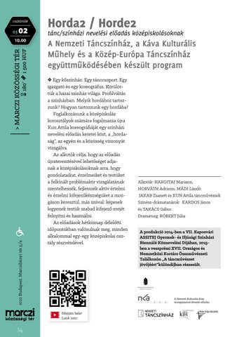 A Nemzeti TĂĄncszĂnhĂĄz, a KĂĄva KulturĂĄlis MĹąhely ĂŠs a KĂśzĂŠp-EurĂłpa TĂĄncszĂnhĂĄz egyĂźttmĹąkĂśdĂŠsĂŠben kĂŠszĂźlt program â?– Egy kĹ‘szĂnhĂĄz. Egy tĂĄnccsoport. Egy igazgatĂł ĂŠs egy koreogrĂĄfus. KĂśrĂźlĂśttĂźk a hazai szĂnhĂĄz vilĂĄga. ProfilvĂĄltĂĄs a szĂnhĂĄzban. Melyik hordĂĄhoz tartozzunk? Hogyan tartozzunk egy hordĂĄba? FoglalkozĂĄsunk a kĂśzĂŠpiskolĂĄs korosztĂĄlyok szĂĄmĂĄra fogalmazza Ăşjra Kun Attila koreogrĂĄfiĂĄjĂĄt egy szĂnhĂĄzi nevelĂŠsi elĹ‘adĂĄs keretei kĂśzt, a „hordasĂĄgâ€?, az egyĂŠn ĂŠs a kĂśzĂśssĂŠg viszonyĂĄt vizsgĂĄlva. Az alkotĂłk cĂŠlja, hogy az elĹ‘adĂĄs ĂşjrateremtĂŠsĂŠvel lehetĹ‘sĂŠget adjanak a kĂśzĂŠpiskolĂĄsoknak arra, hogy gondolataikat, ĂŠrzelmeiket ĂŠs testĂźket a felkĂnĂĄlt problĂŠmakĂśr vizsgĂĄlatĂĄnak szentelhessĂŠk, fejlesszĂŠk aktĂv ĂŠrtelmi ĂŠs ĂŠrzelmi kifejezĹ‘kĂŠszsĂŠgĂźket a mozgĂĄson keresztĂźl, mĂĄs szĂłval: kĂŠpesek legyenek testĂźk szabad kifejezĹ‘ erejĂŠt felnyitni ĂŠs hasznĂĄlni. Az elĹ‘adĂĄsok hĂŠtkĂśznap dĂŠlelĹ‘tti idĹ‘pontokban valĂłsulnak meg, minden alkalommal egy-egy kĂśzĂŠpiskolai osztĂĄly rĂŠszvĂŠtelĂŠvel.