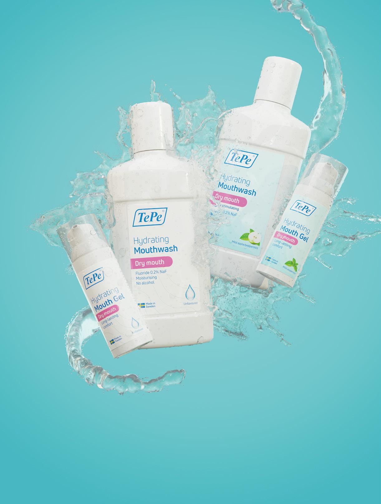 TePe Hydrating Mouthwash och Mouth Gel ger en behaglig känsla vid torr mun, återfuktar slemhinnan och skyddar tänderna. Vi rekommenderar produkterna utan tillsatt smak för personer med väldigt torr och känslig mun och de milt smaksatta för dem med måttliga problem. Läs mer på www.tepe.com/sv/muntorrhet
