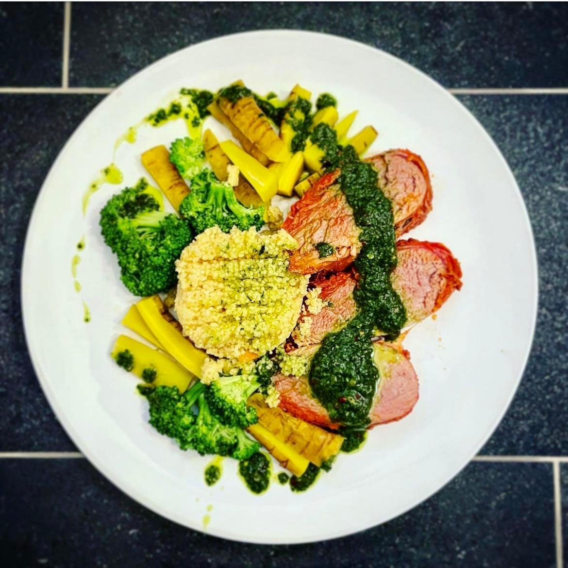 Pictured: Pork tenderloin and couscous with steamed broccoli and carrots topped with celery greens and garlic chimichurri Shared by CSA member @erikadodge