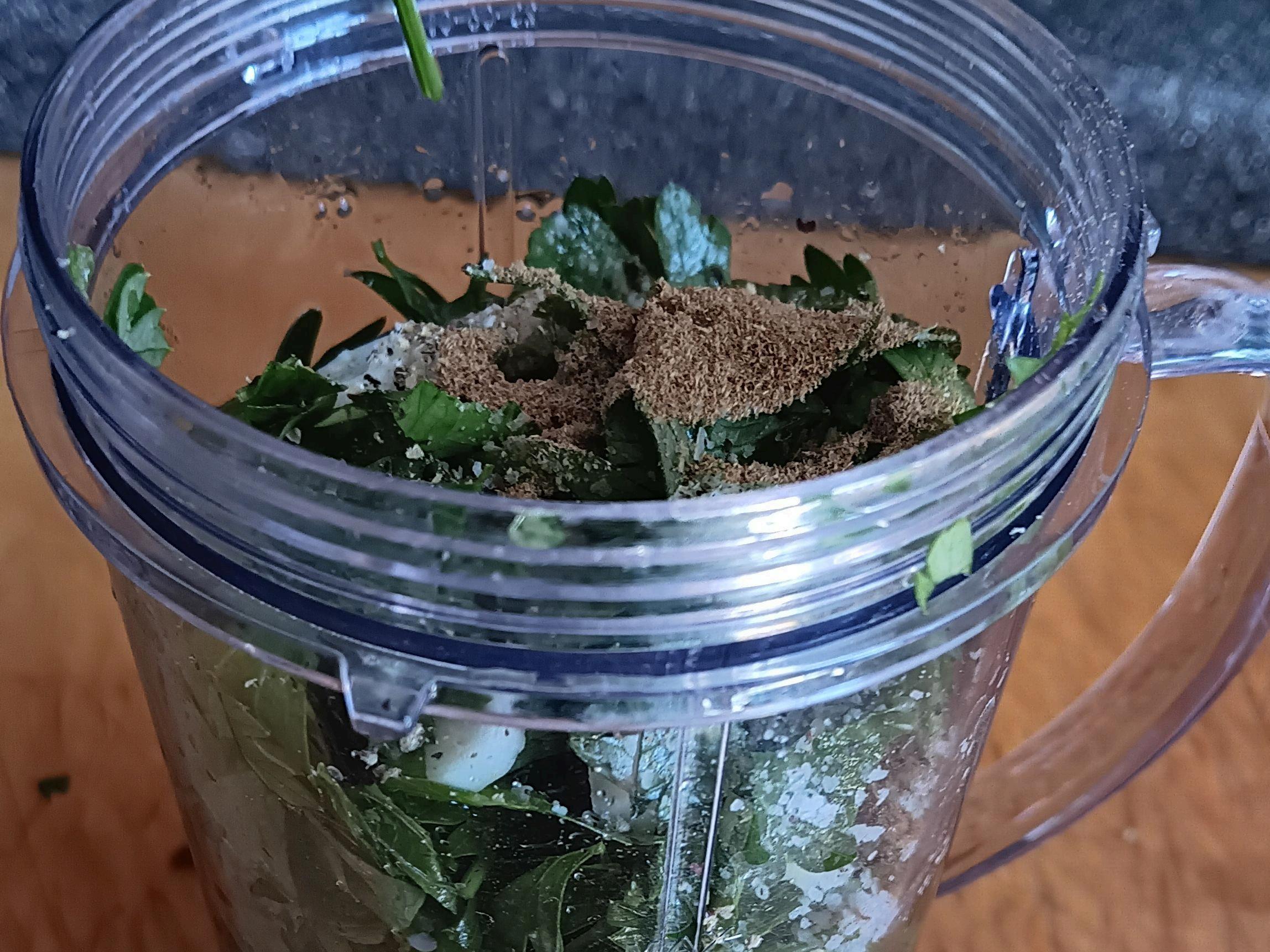 Start by lightly chopping parsley, scallions and garlic.Then I put into bullet blender cup (or food processor), add salt,black pepper, cumin.